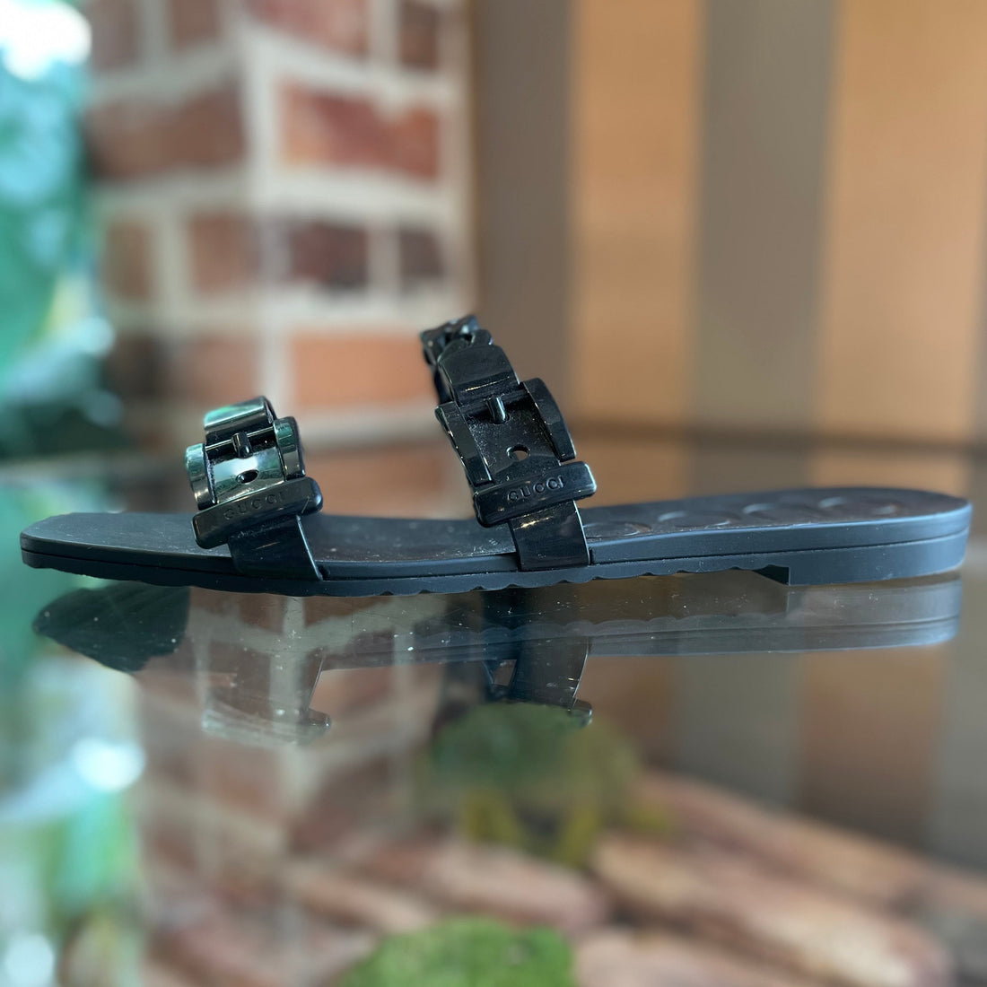 Details Brand: Gucci Color: Black Material: Rubber Approx Measurements: Insoles: 10" Heel: 0.25" Type: Sandals...