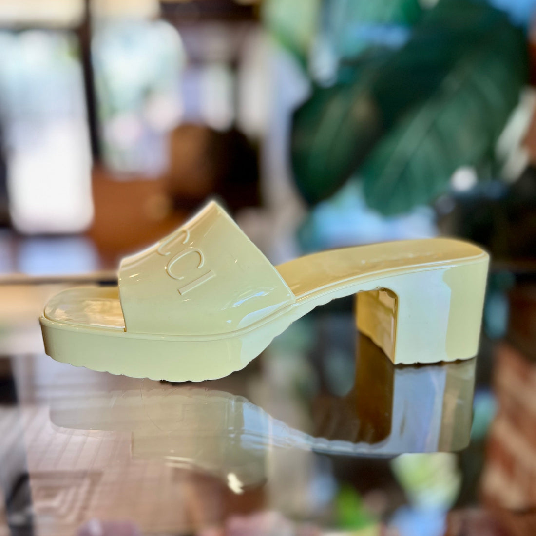 Details Brand: Gucci Color: Yellow Material: Rubber Approx Measurements: Heel: 2.25" Type: Heel Description: Gucci...