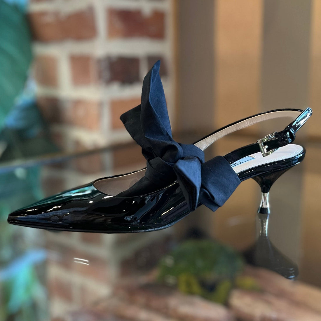 PRADA Black Patent Leather Pointed Toe Sling Backs w/bow SZ 36.5 (6.5 US)