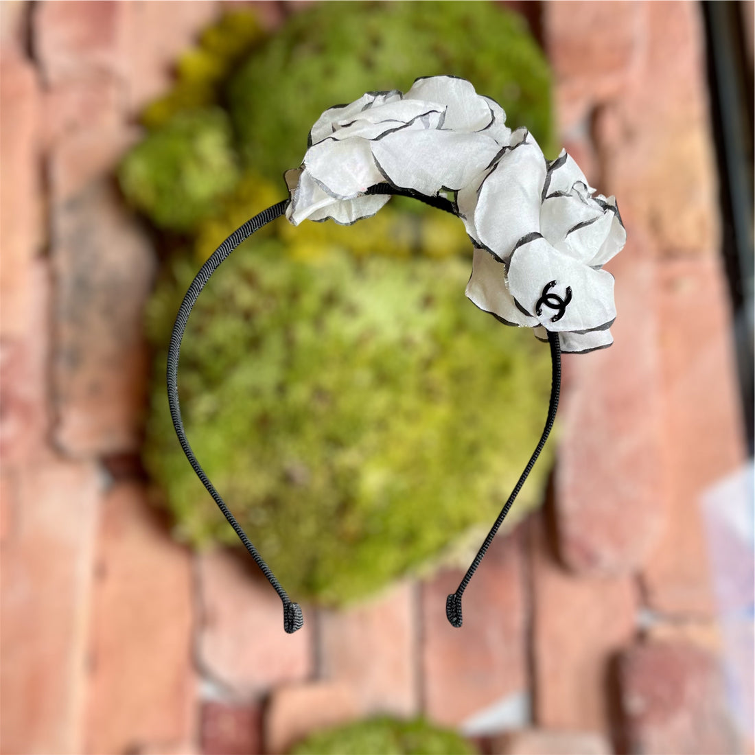 Details Brand: Chanel Color: Black Material: Fabric Approx Measurements: Flower L X H: 3" x...