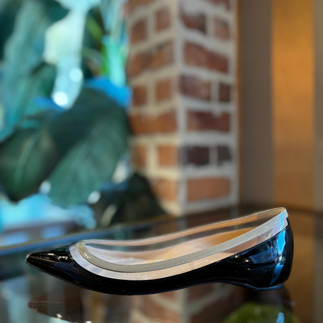 Details Brand: Christian Louboutin Color: Black Approx Measurements: Insole: 8.5" Type: Flats Description: Black Patent...