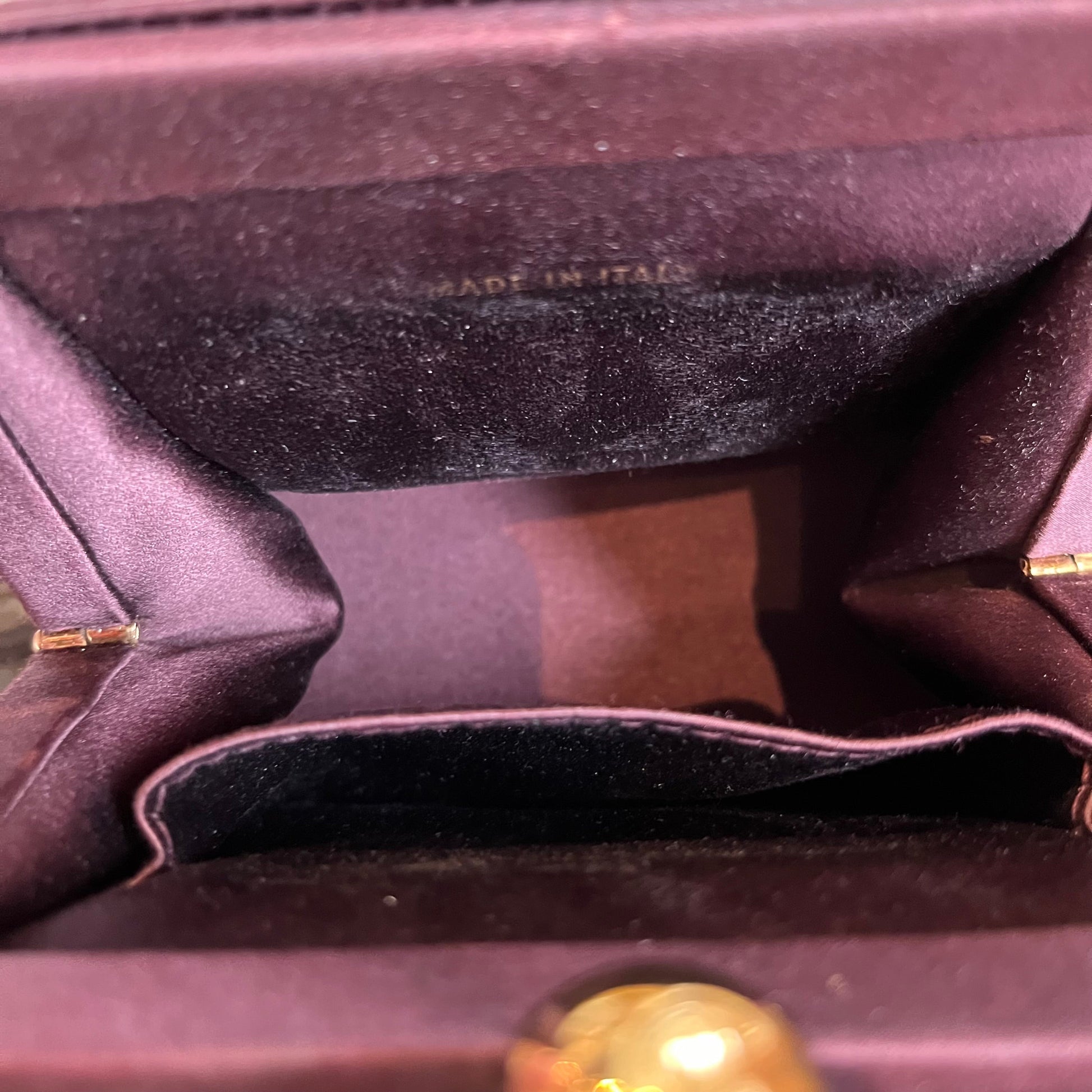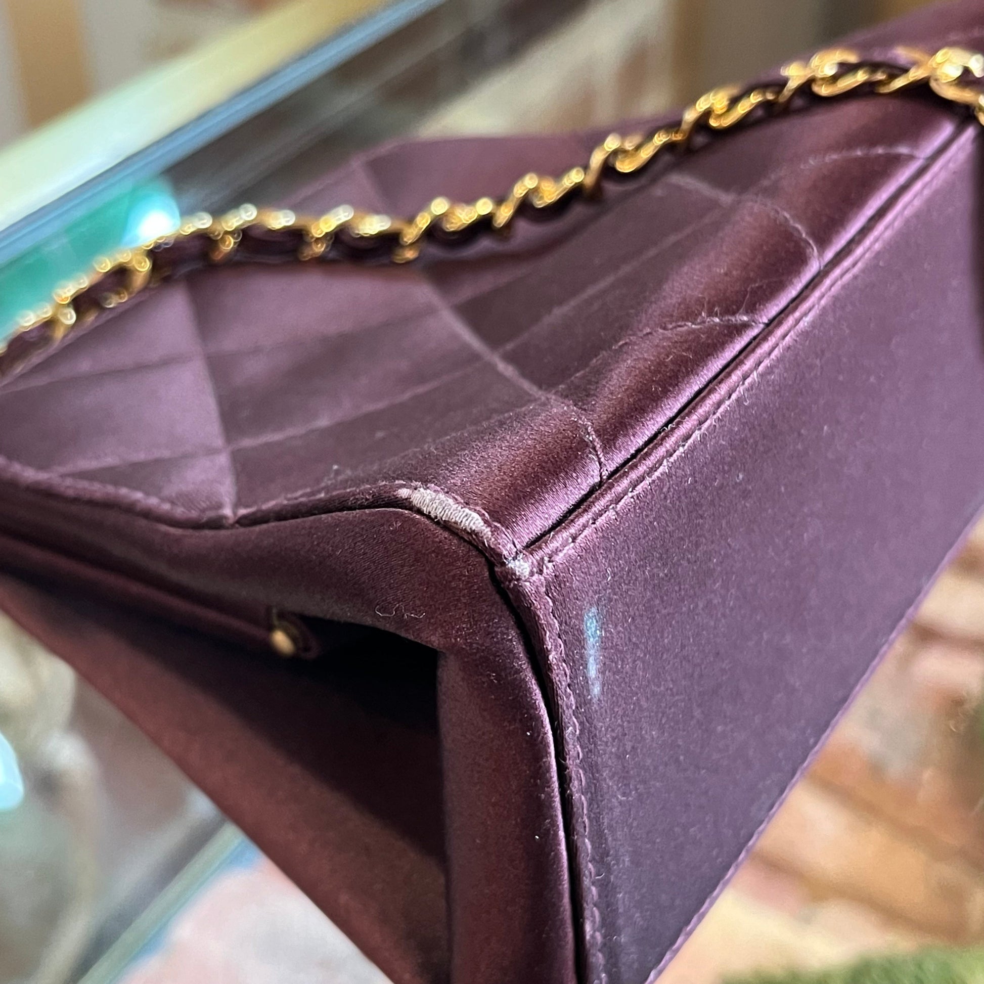 - Exterior: The top/bottom corners are rubbed and the satin material in the chain is unglued however still wearable as is.