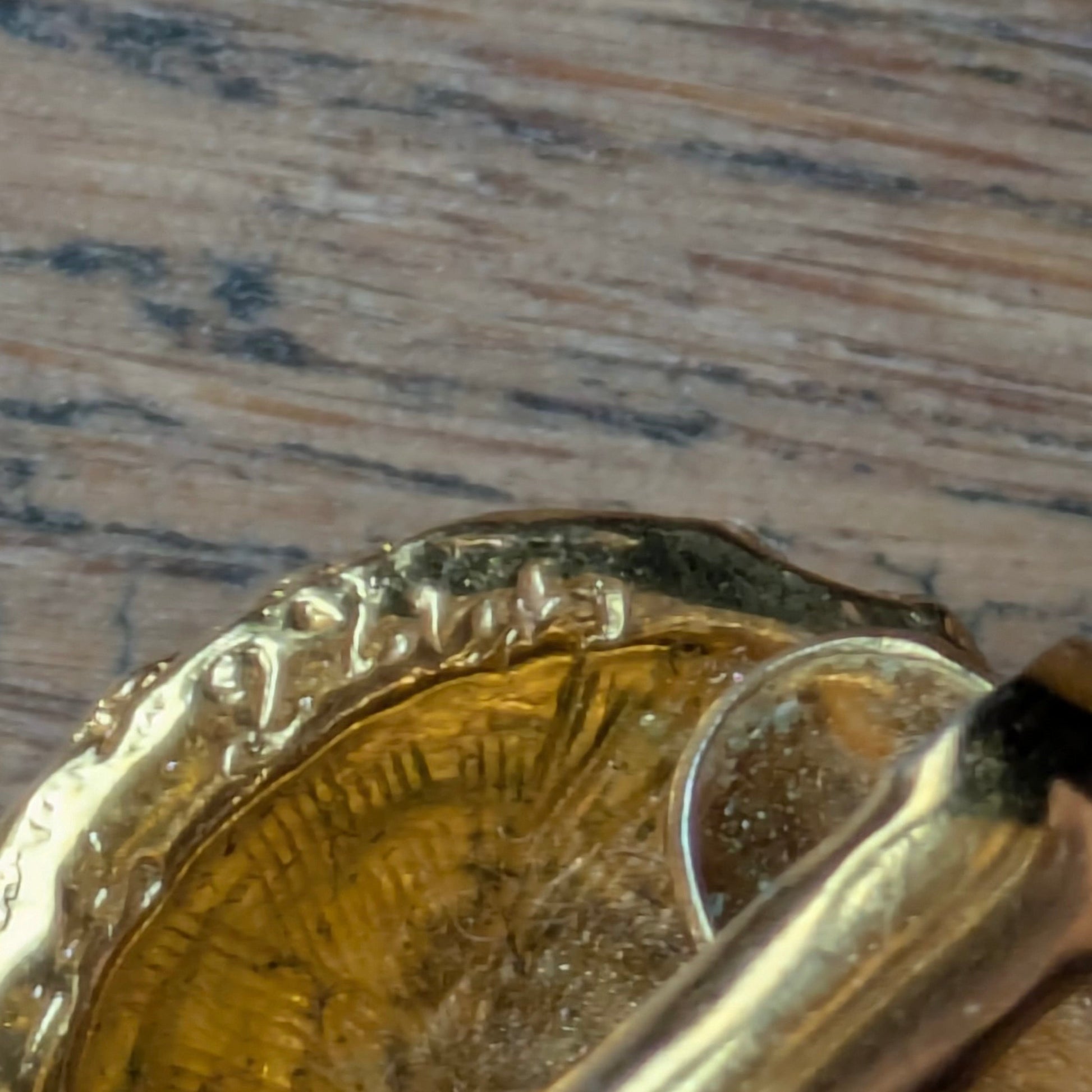 - Exterior: The hardware is moderately scratched allowing the metal underneath to peek through. The crystals remain intact. The hinge & spring closure functions properly.