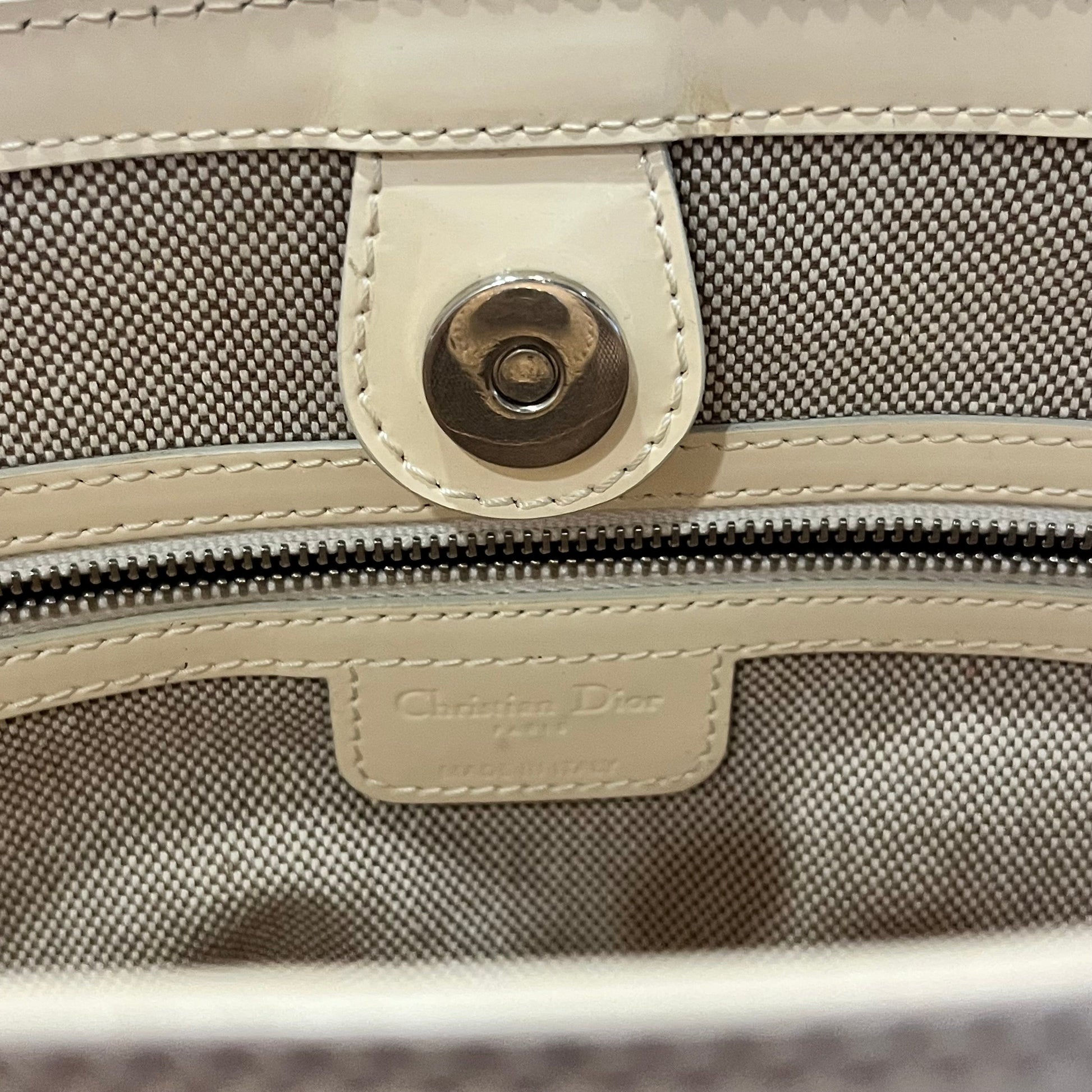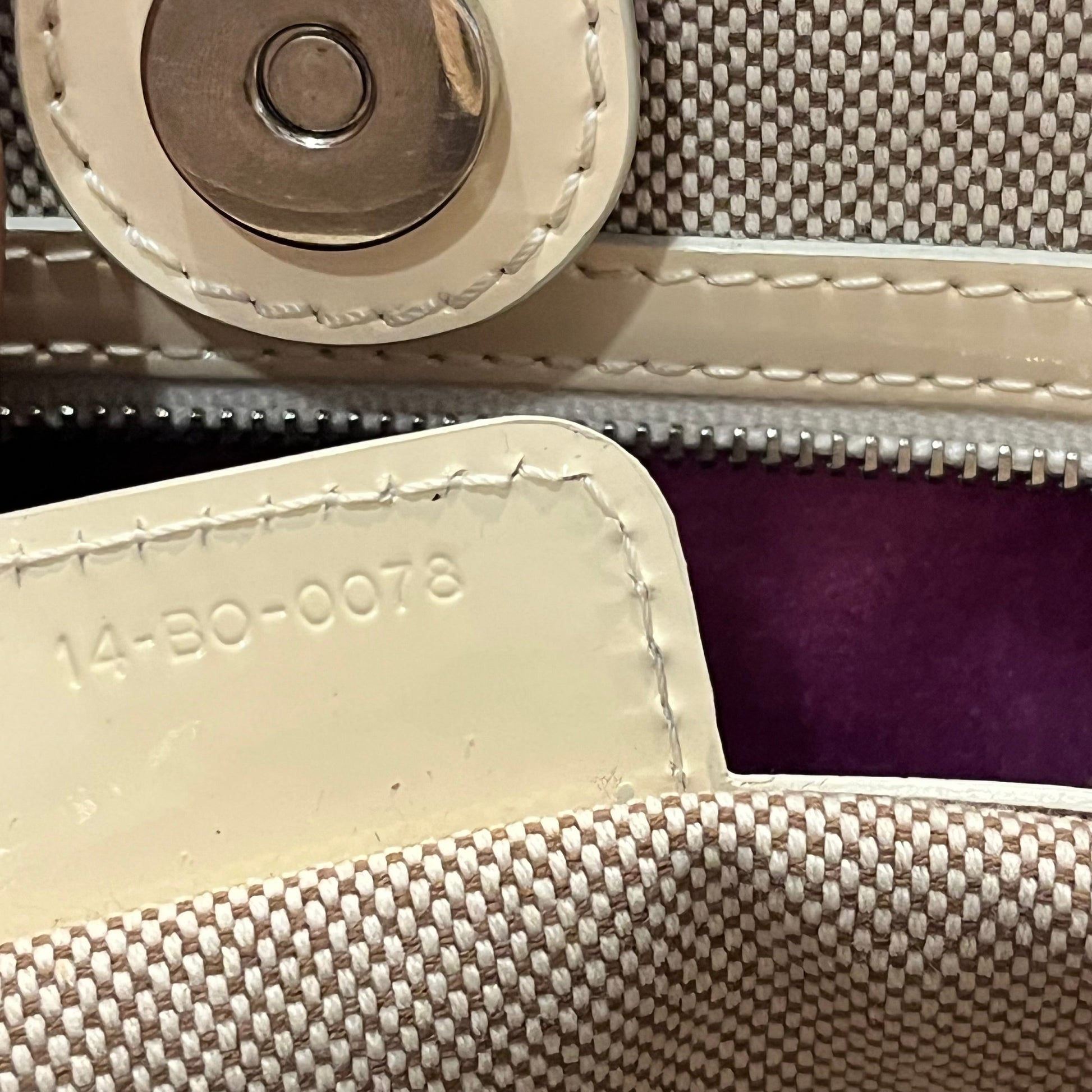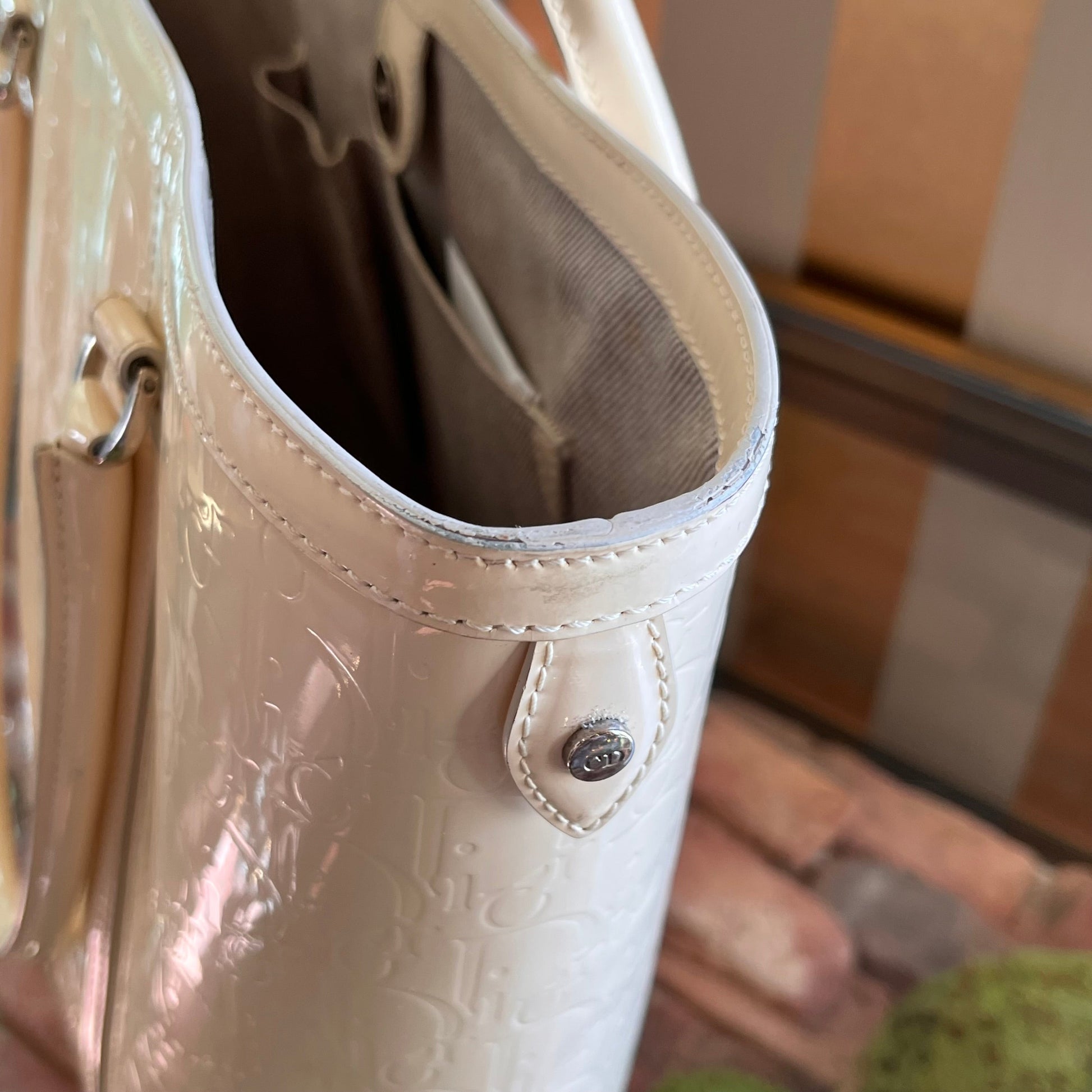 - Exterior: The patent leather is bright and shiny. It has developed transfer marks, scratches and scuffing. Overall it's in good condition. It remains sturdy and structured.