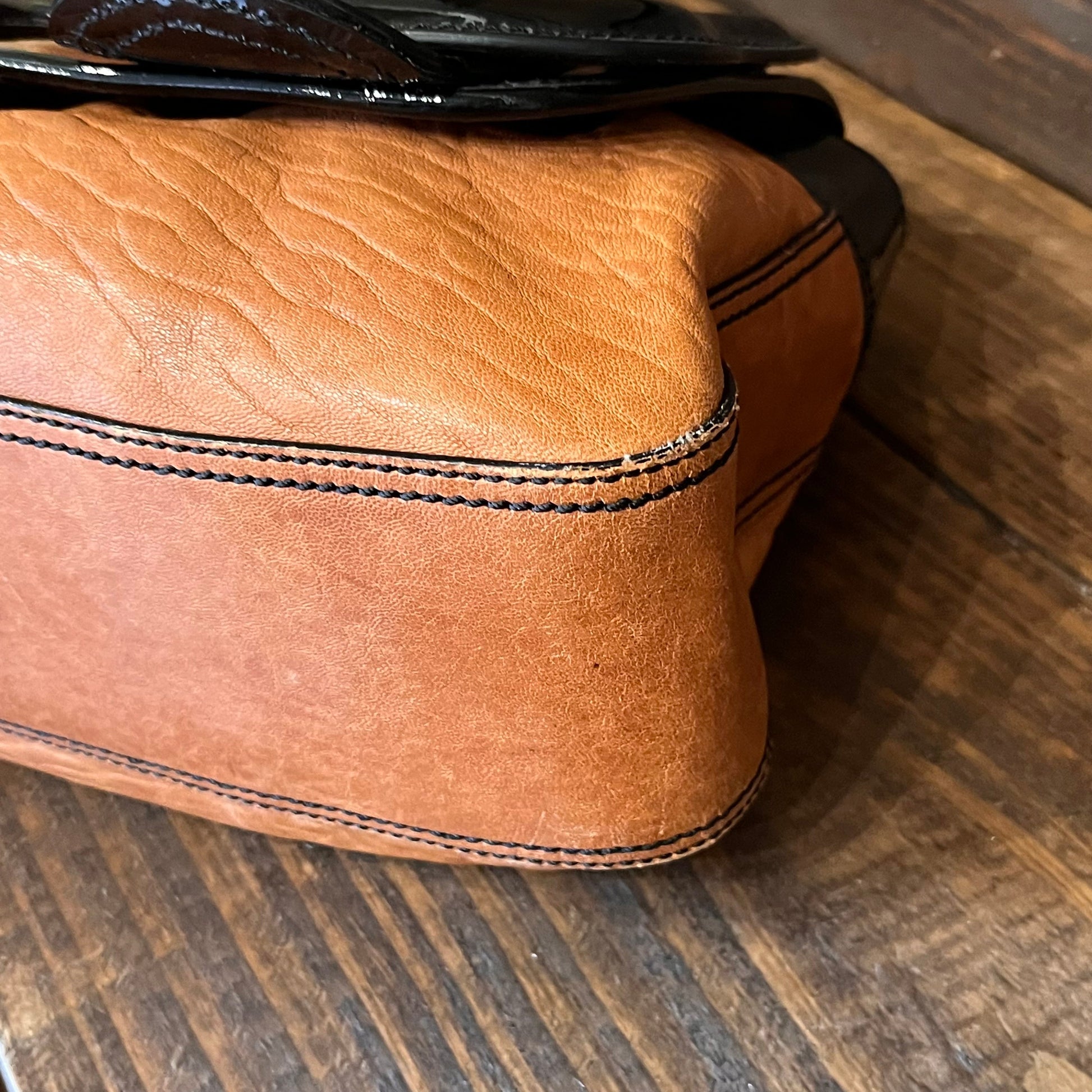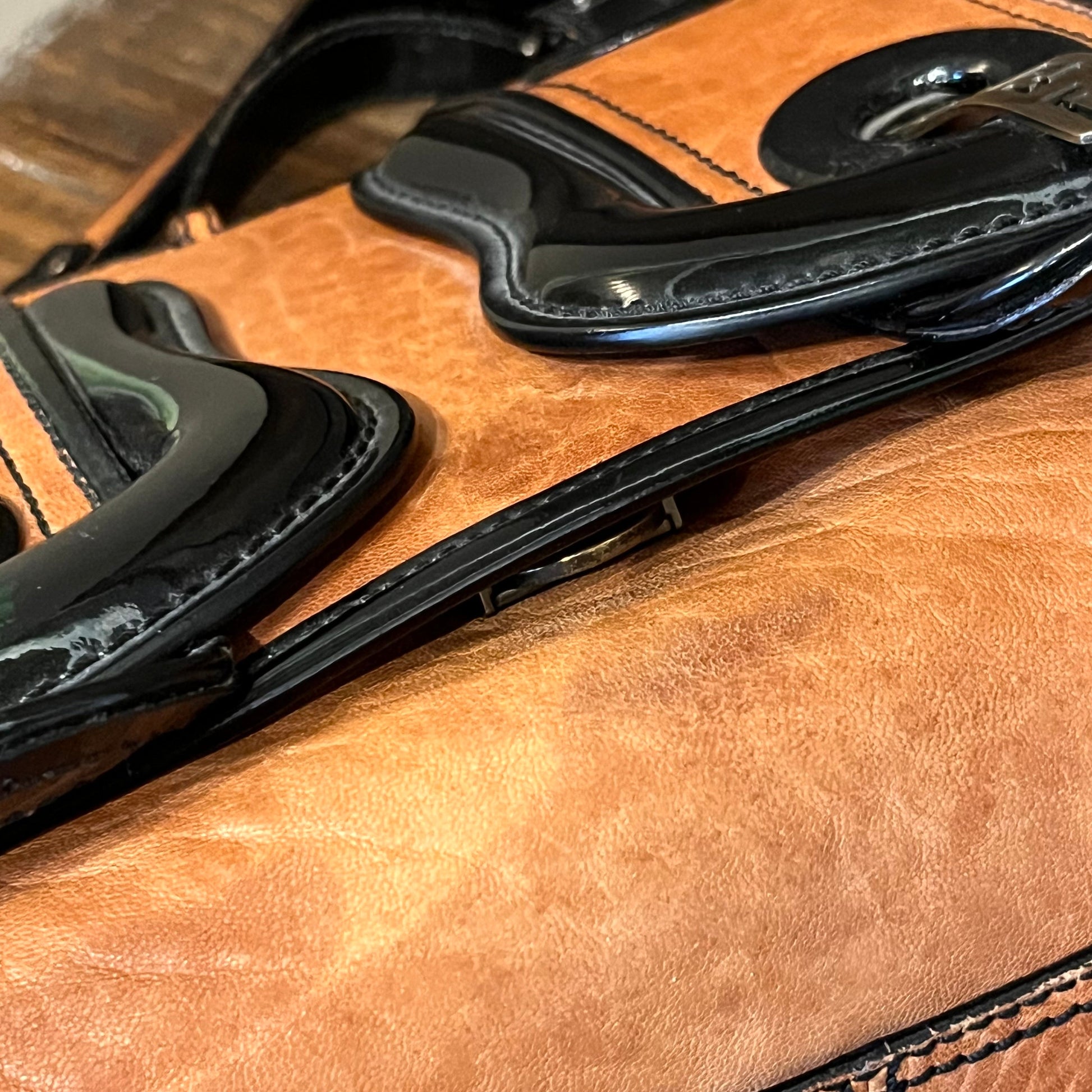 - Exterior: The patent leather is shiny and bright. The exterior displays glazing wear, scratches, darkening, rubbing, scratches, indentations and gentle cloudiness to the patent leather. Overall it's in very good condition.