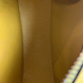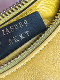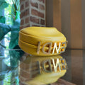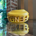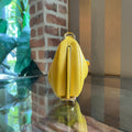 - Vibrant yellow leather with curved, crescent-shaped silhouette