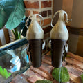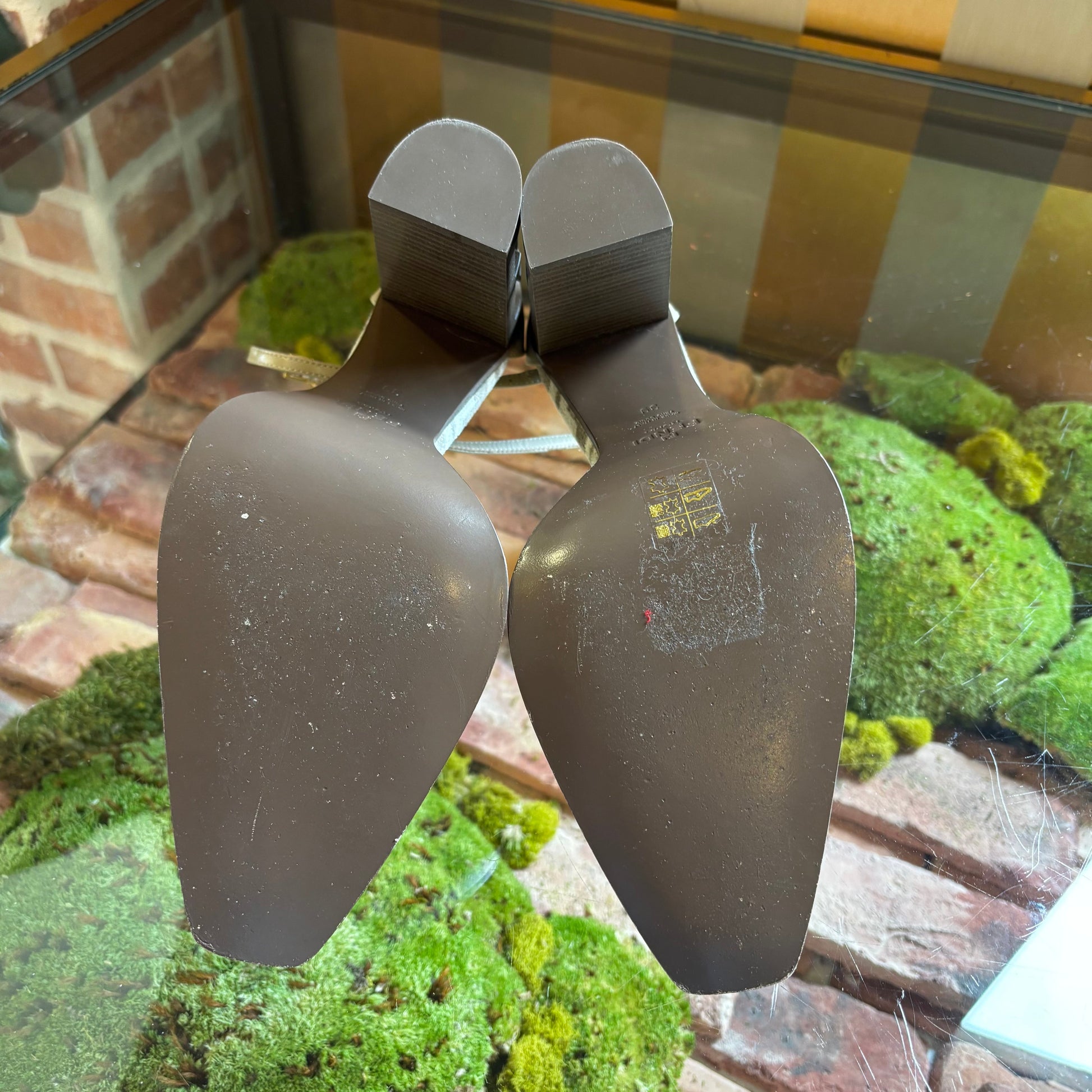 - Exterior: Wear around the soles. Creasing on back of ankle straps. Color is still clear and vibrant. Overall very good condition.