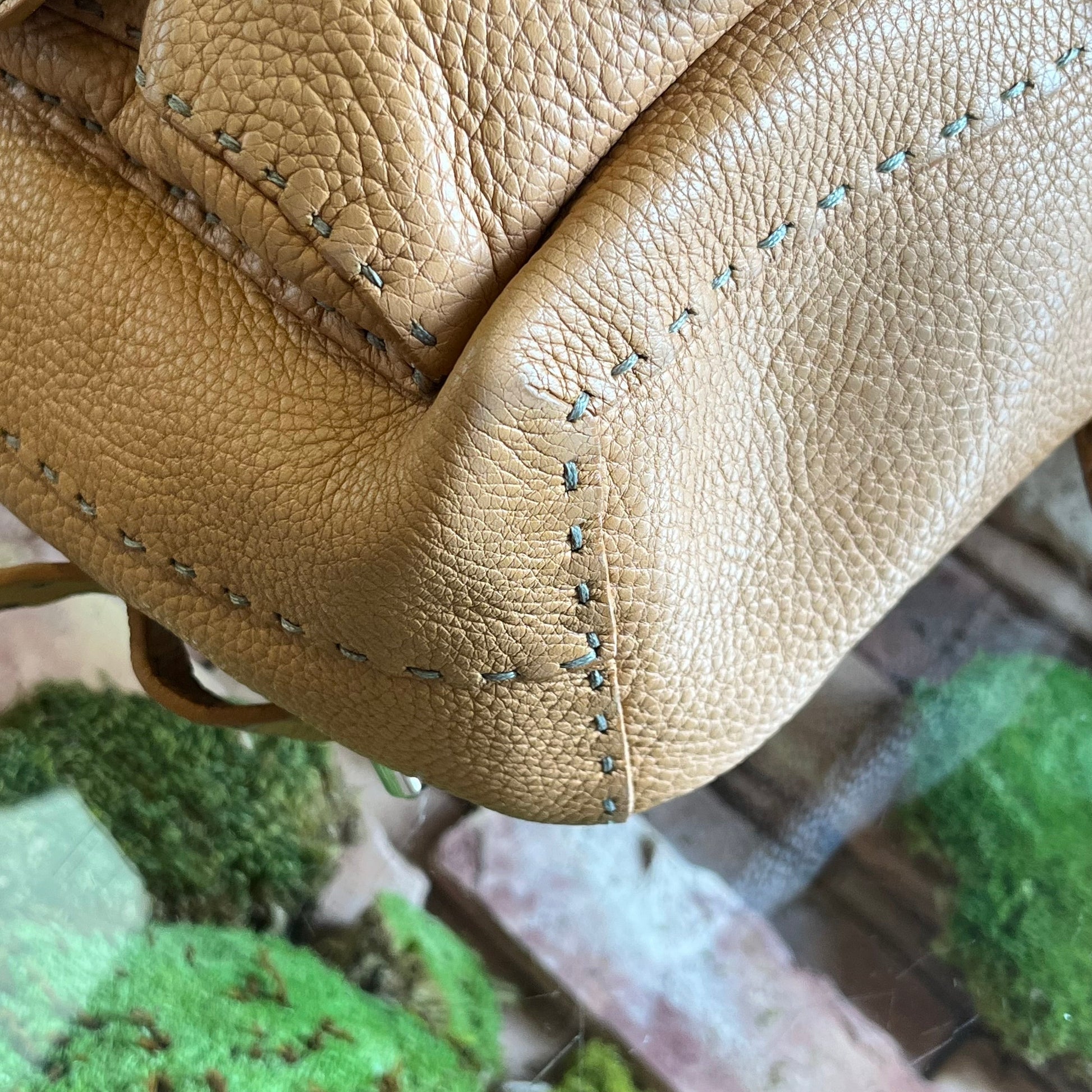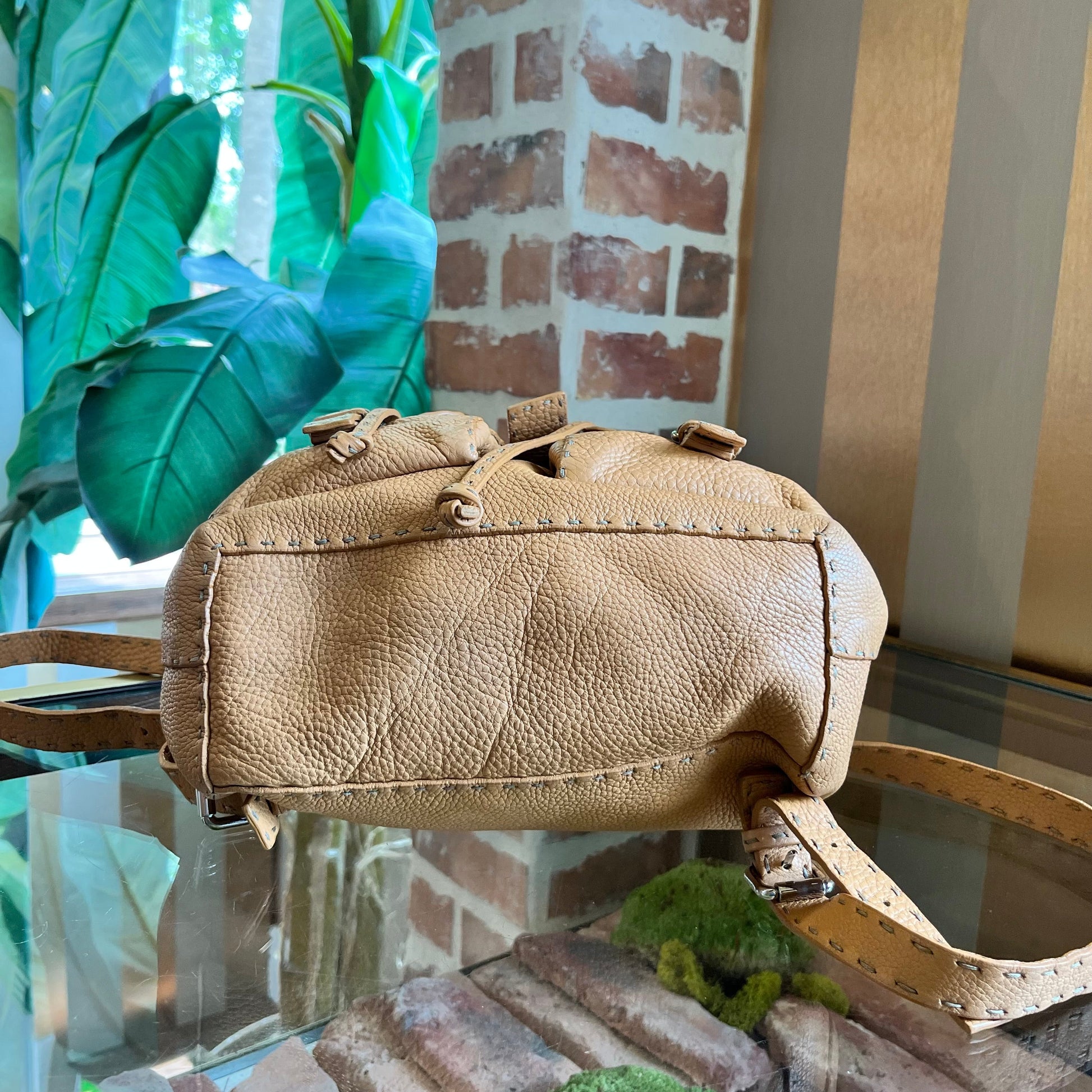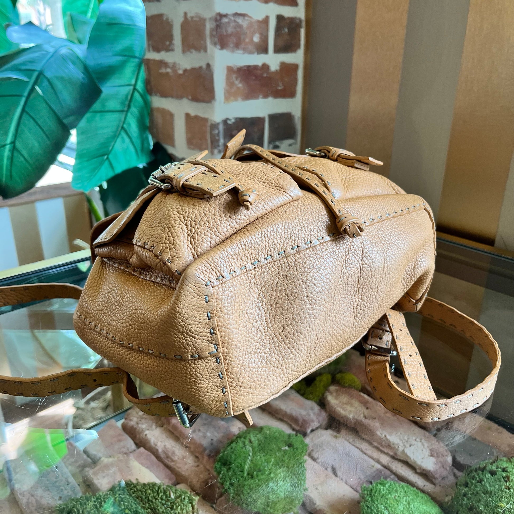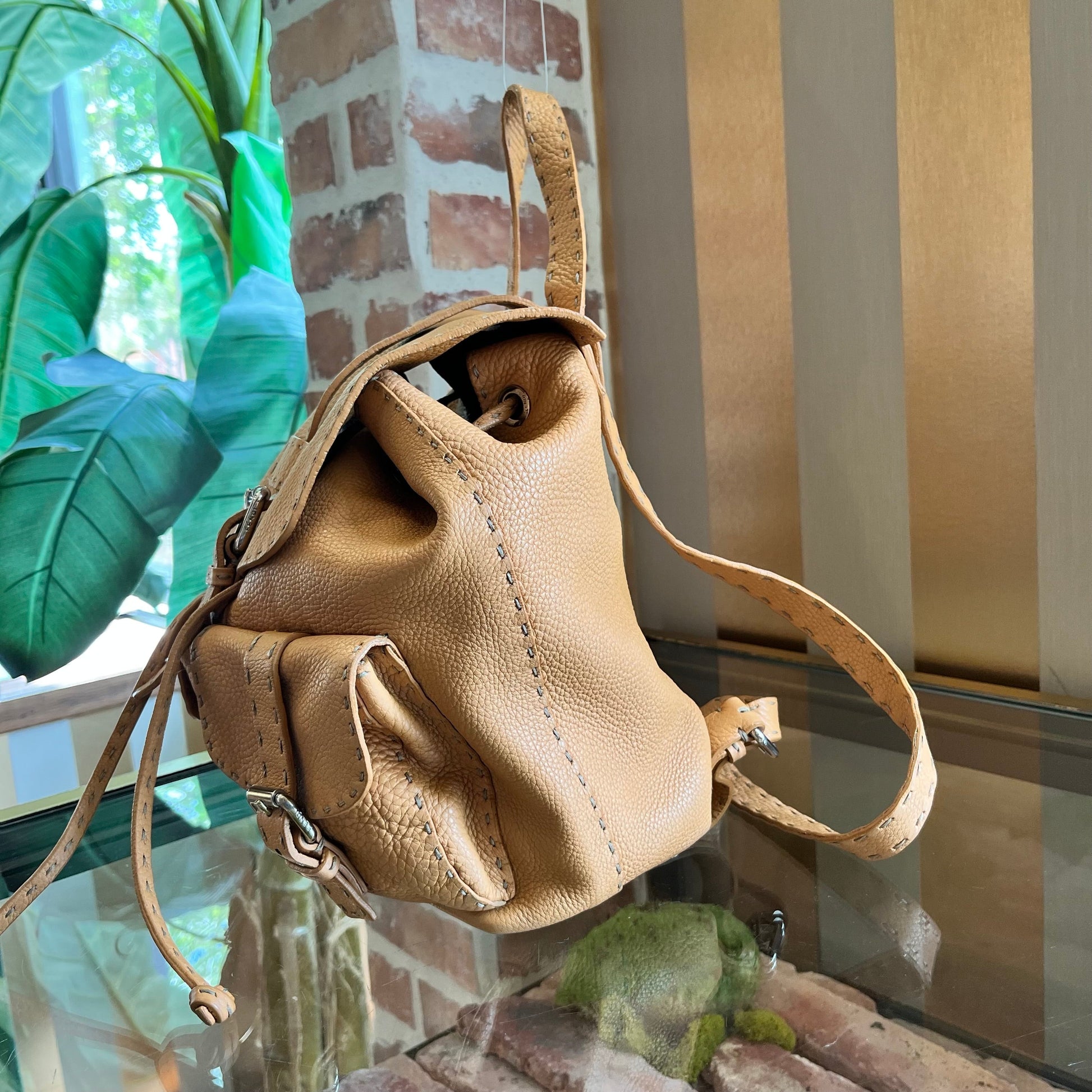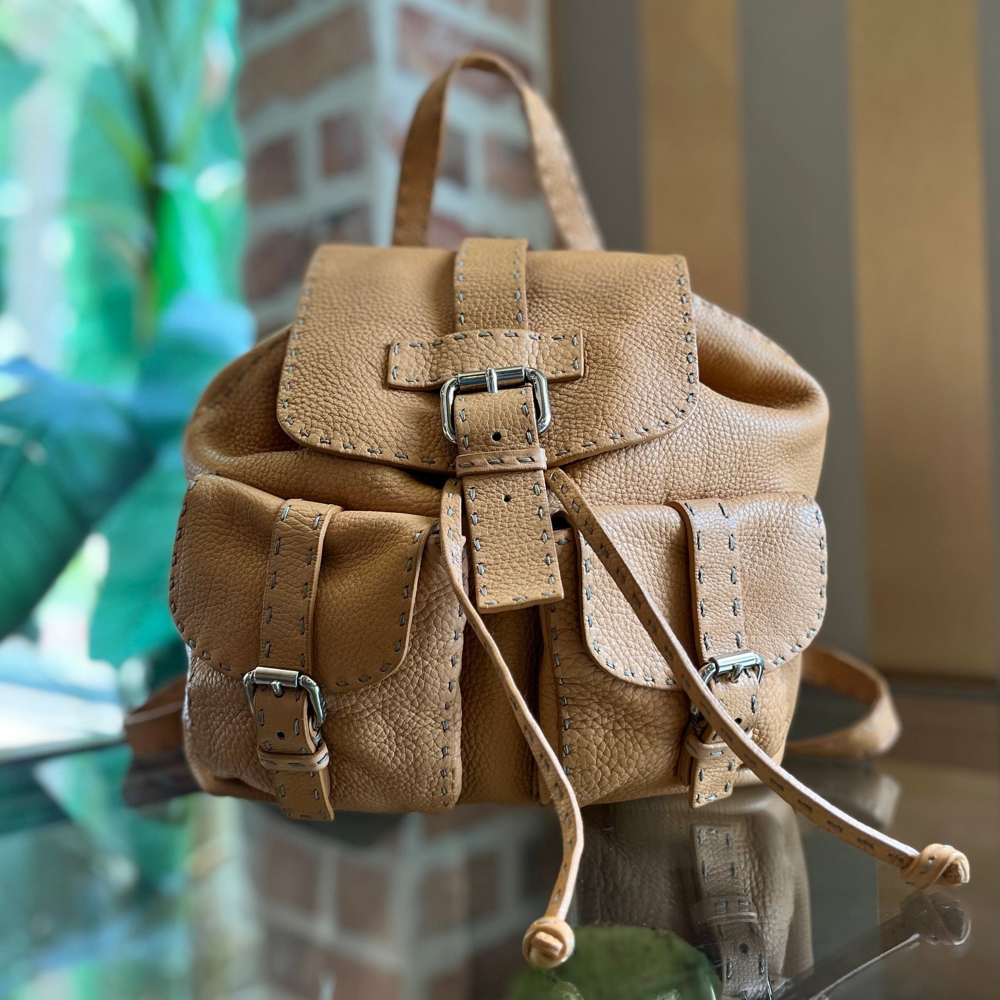 A refined backpack in Fendi's luxurious Selleria calfskin leather, known for its buttery texture and artisanal stitching. The structured silhouette features adjustable straps and multiple compartments for organized storage, while the subtle branding exudes understated elegance. Perfect for those who appreciate Italian craftsmanship with everyday functionality. B+ Very Good Condition