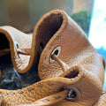 - Exterior: The leather is supple and rich with wear to the corners, moderate rubbing, gentle darkening, cracks and splits to the glazing and wear throughout the drawstring.
