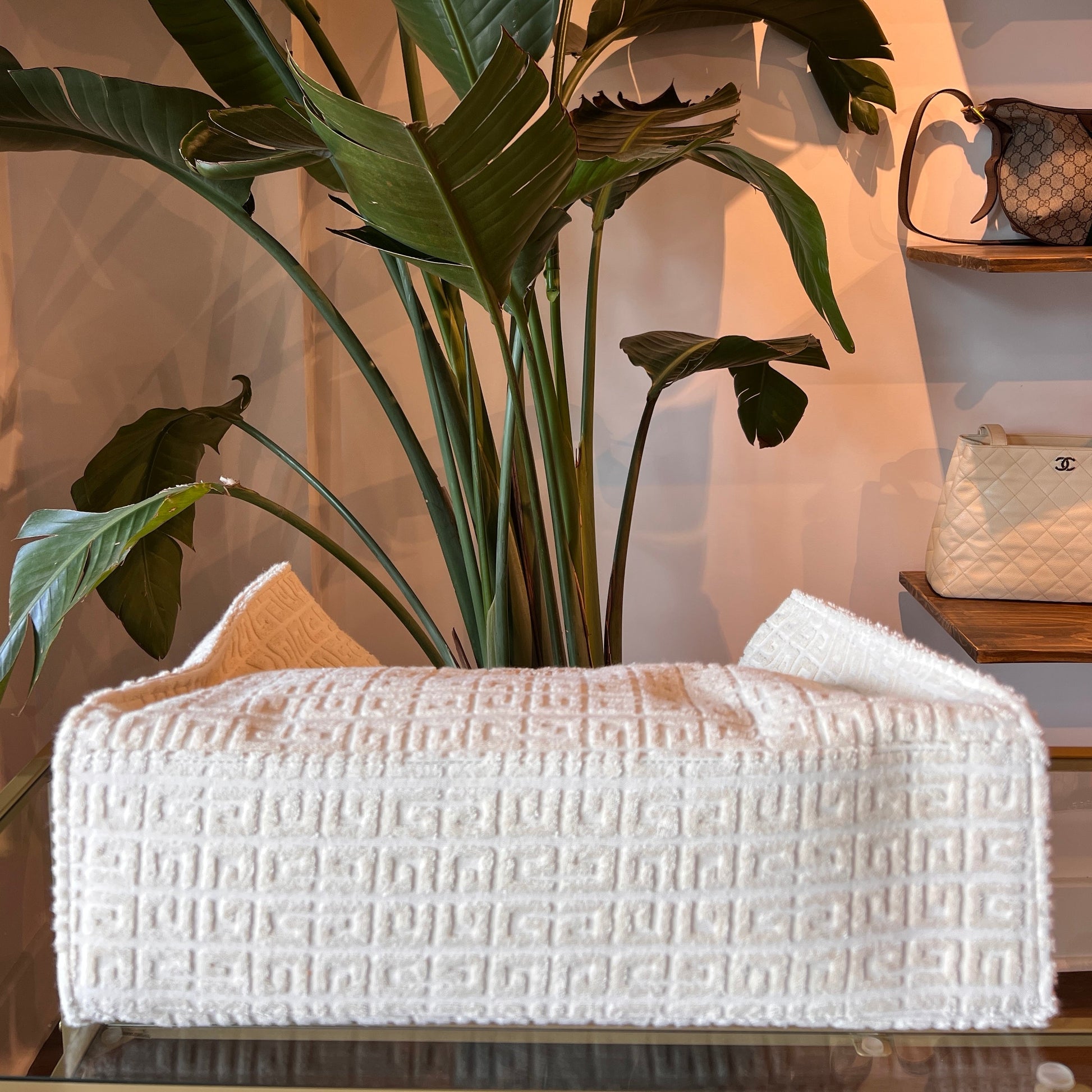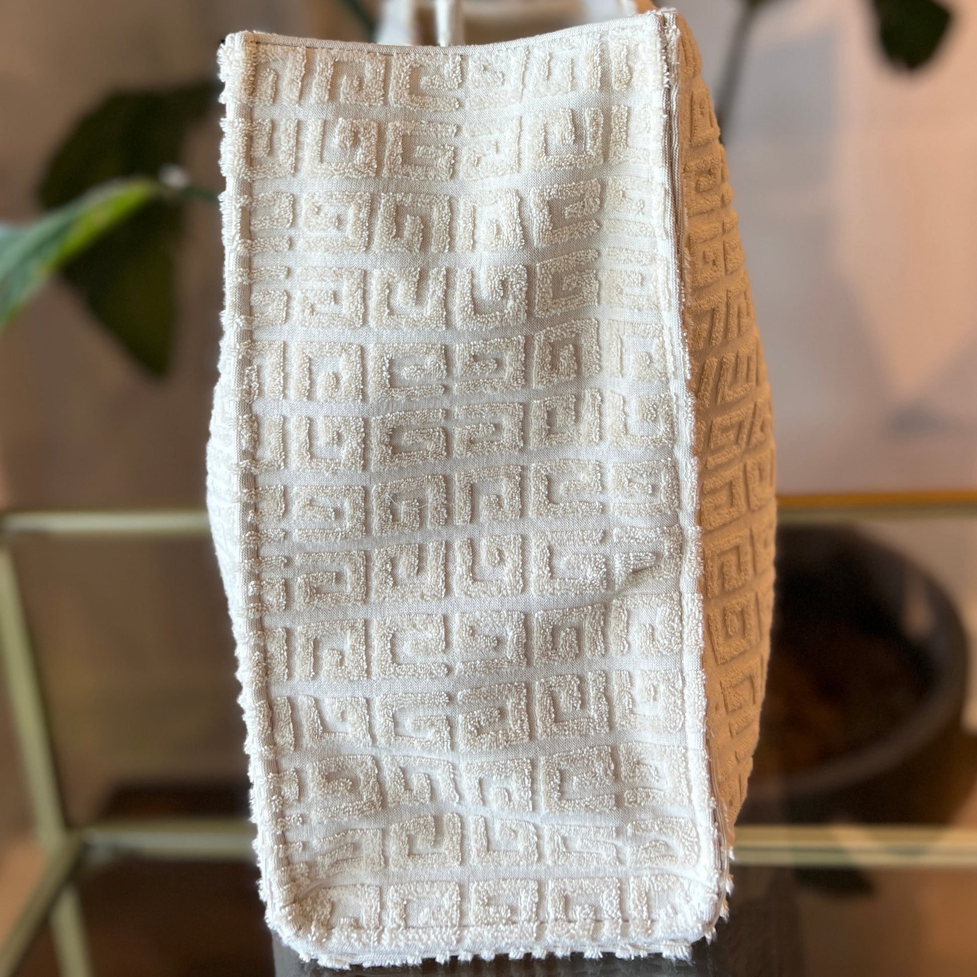 - Material: Plush ivory terry cloth with tonal stitching