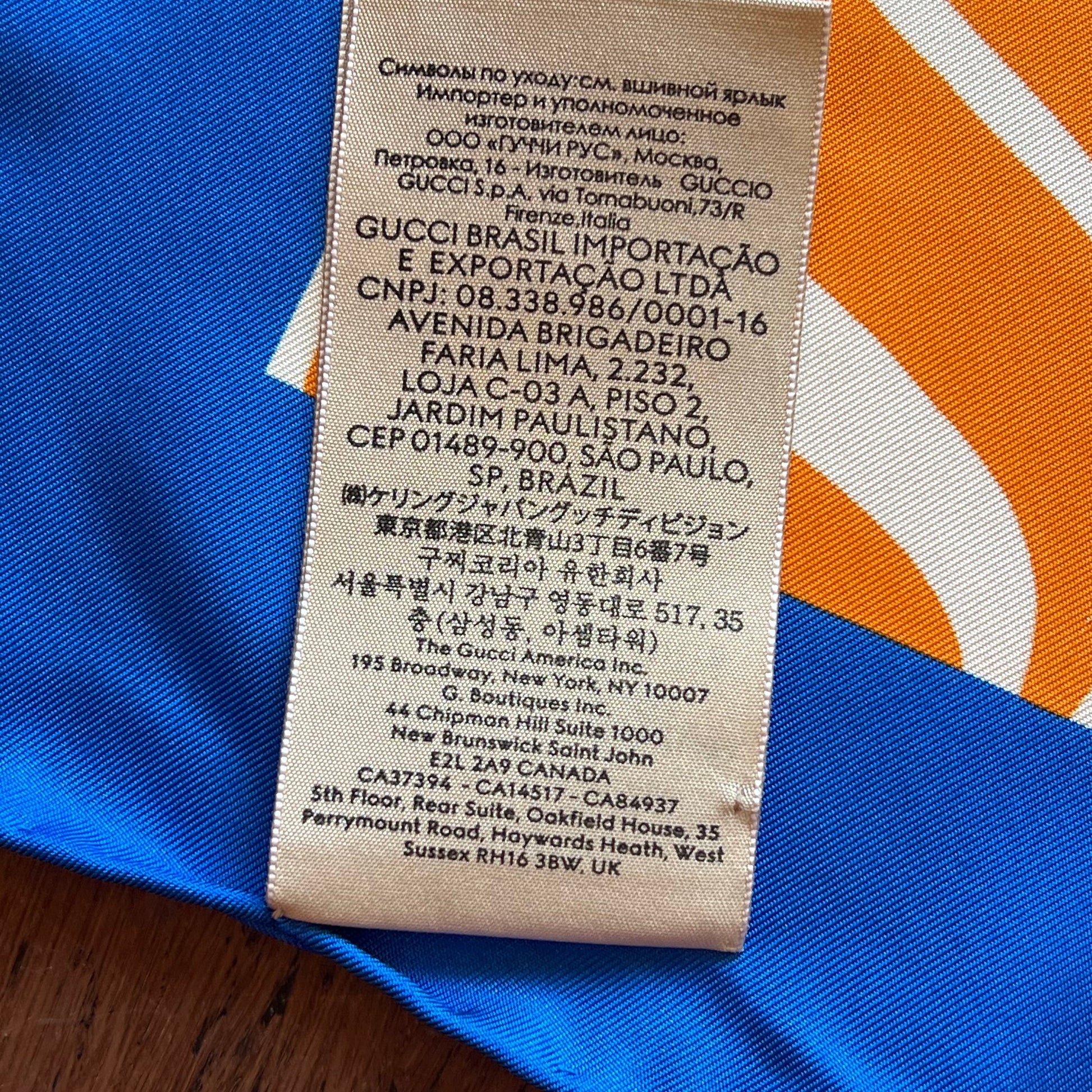 The Gucci x Adidas scarf features a vibrant orange, blue, and white silk design, blending the iconic GG monogram with the Adidas trefoil motif. This statement accessory adds a sporty yet luxurious flair to any ensemble. B+ Very Good Condition
