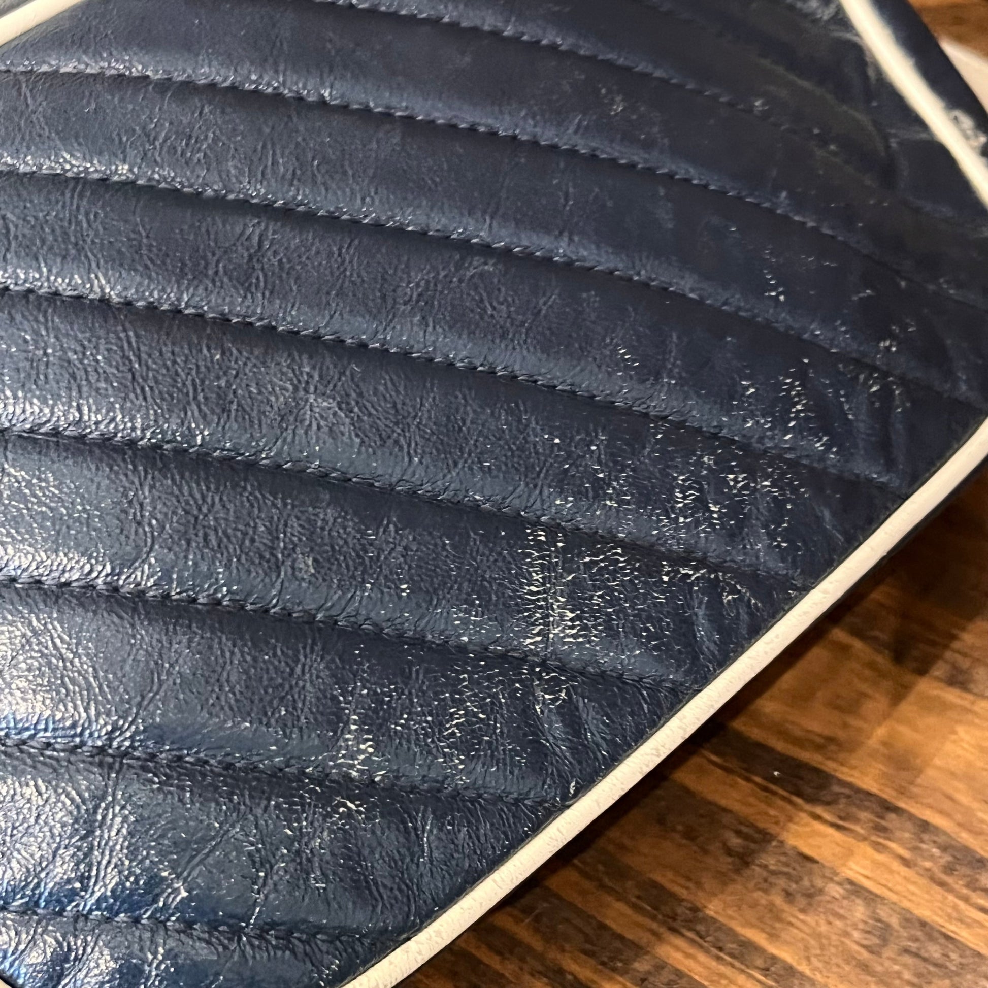 - Handle: The leather strap displays moderate rubbing, darkening, small marks and creasing.