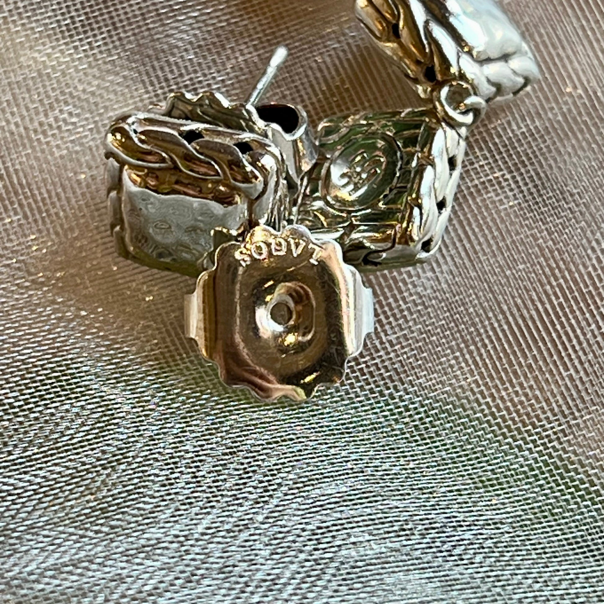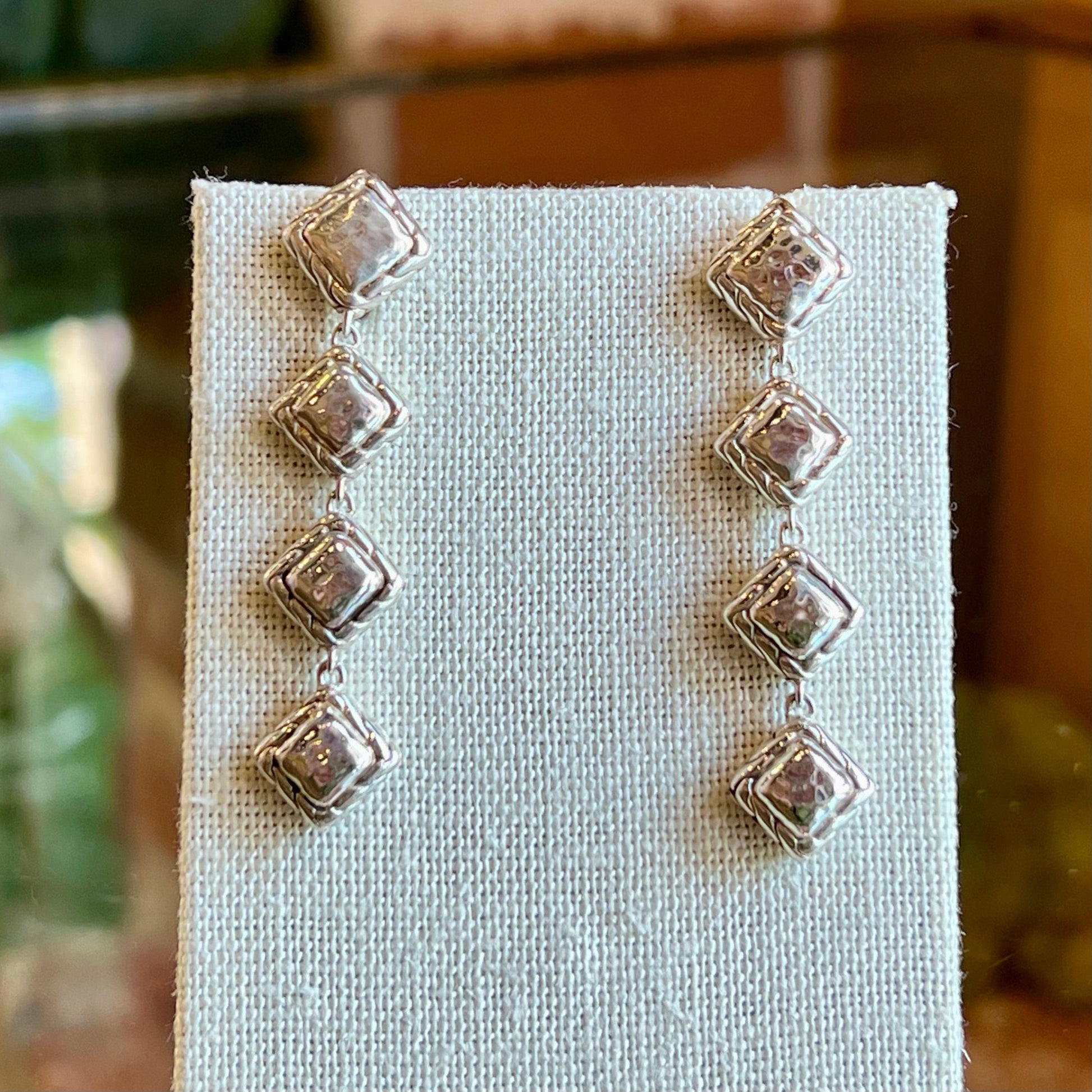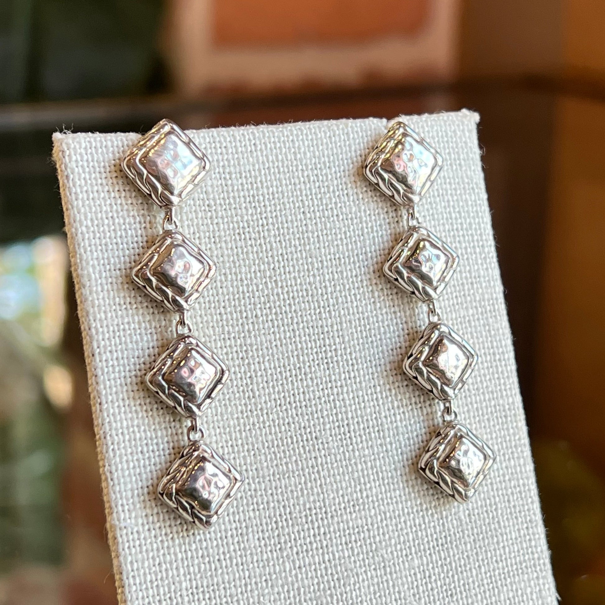 A celebration of artisanal craftsmanship, these drop earrings feature a unique four-square design crafted from sterling silver, showcasing John Hardy's signature attention to detail and organic elegance. Their bold yet refined aesthetic makes them a perfect accessory for adding a touch of modern sophistication to any outfit. B+ Very Good Condition