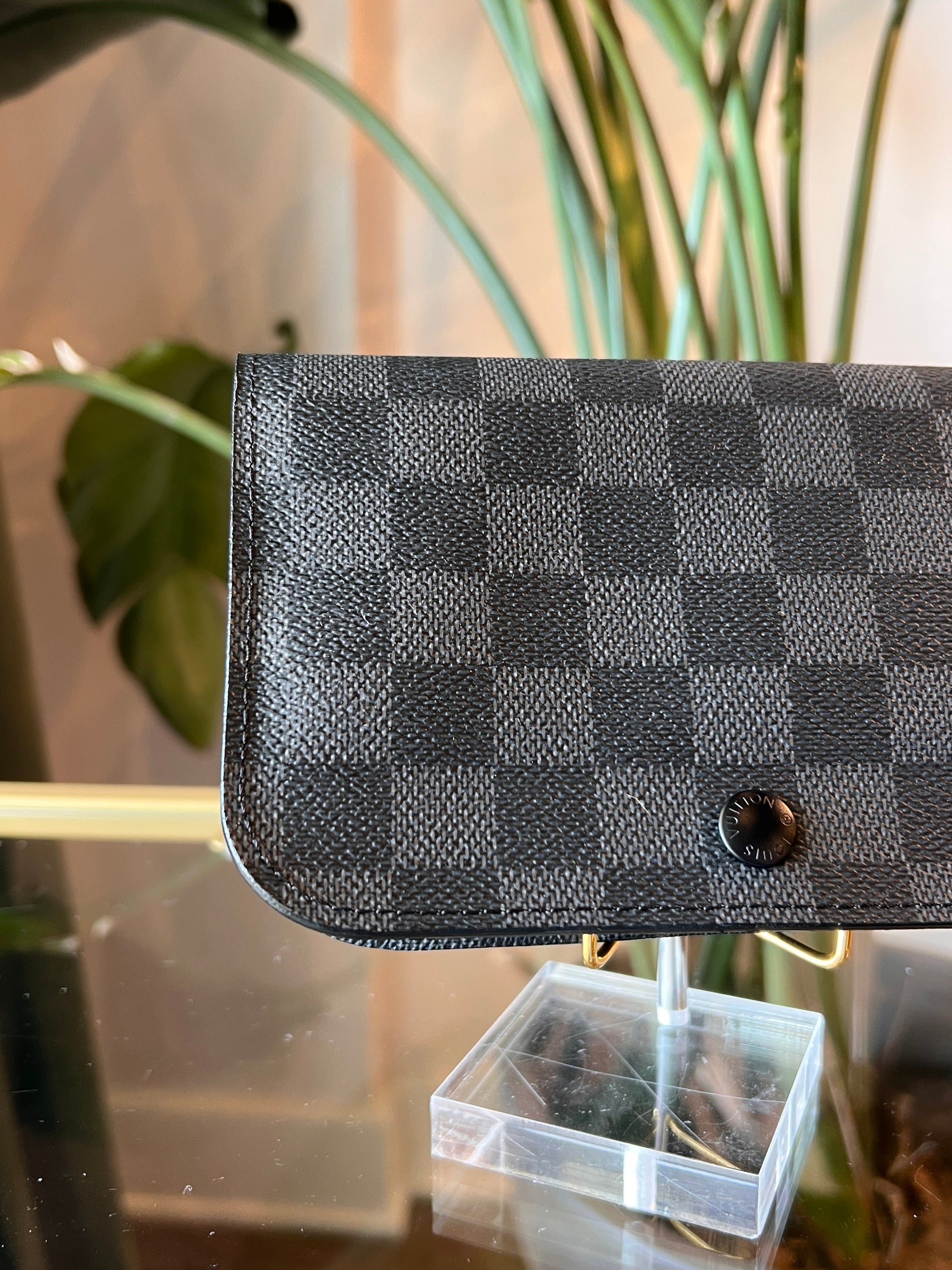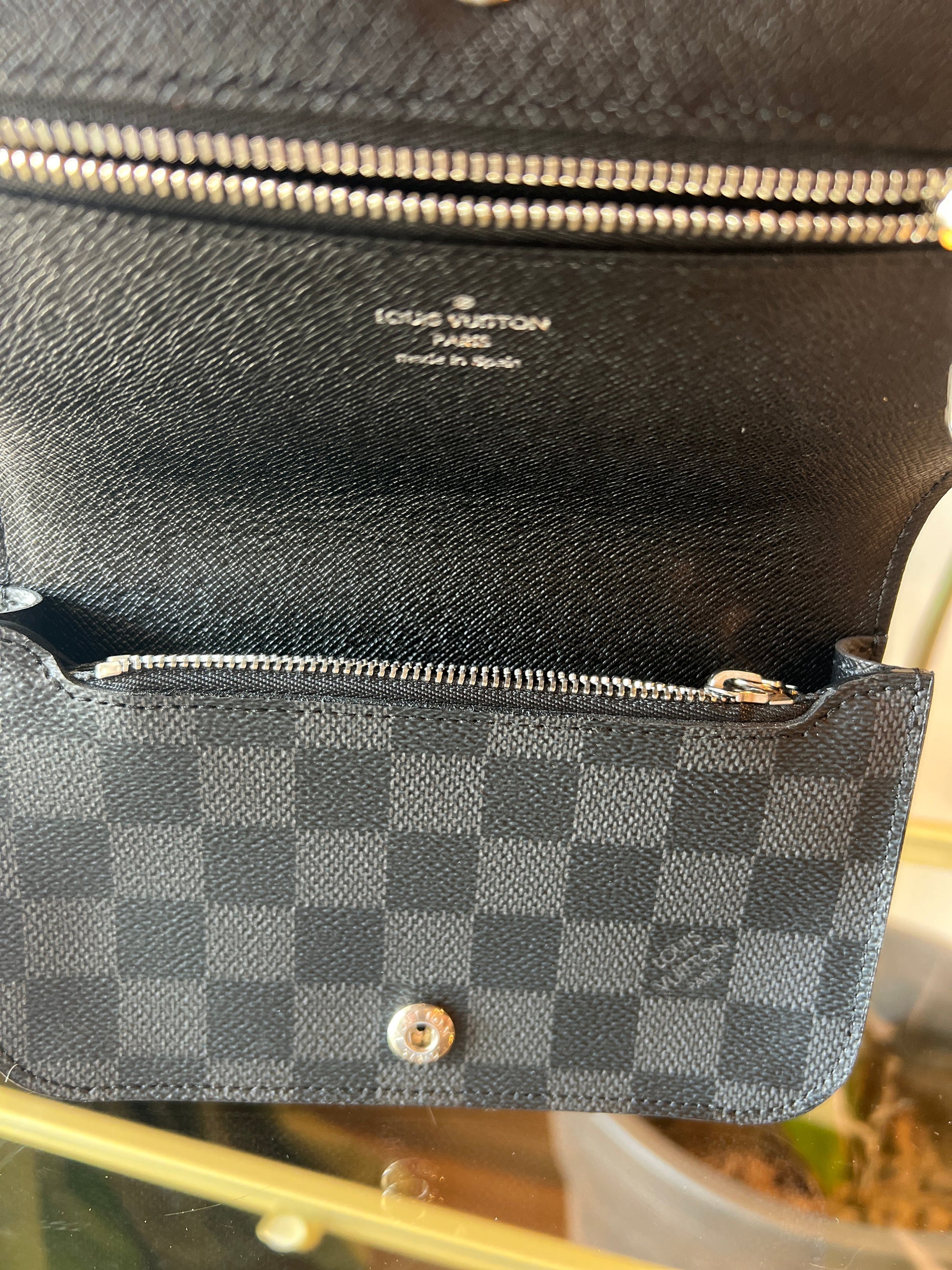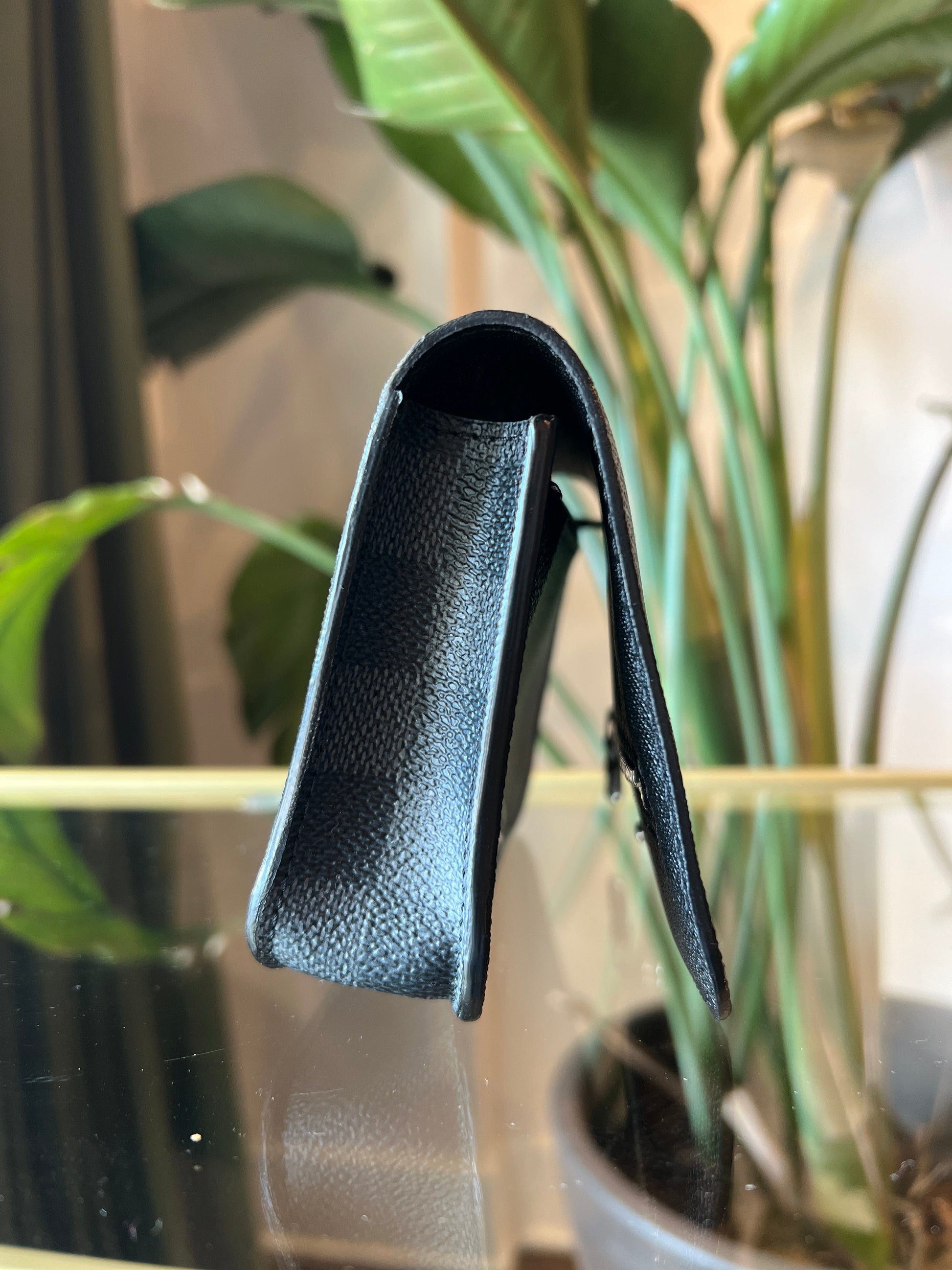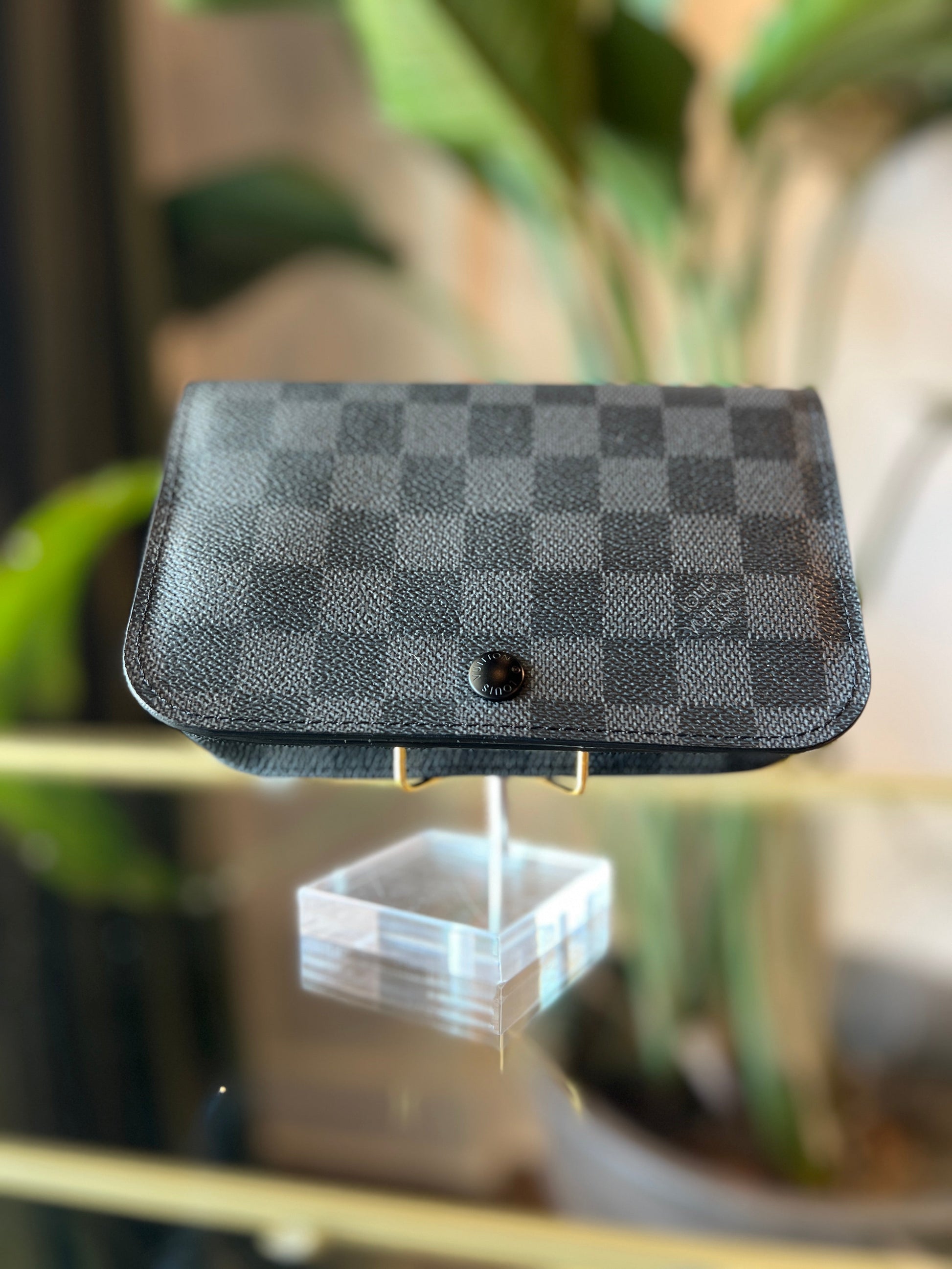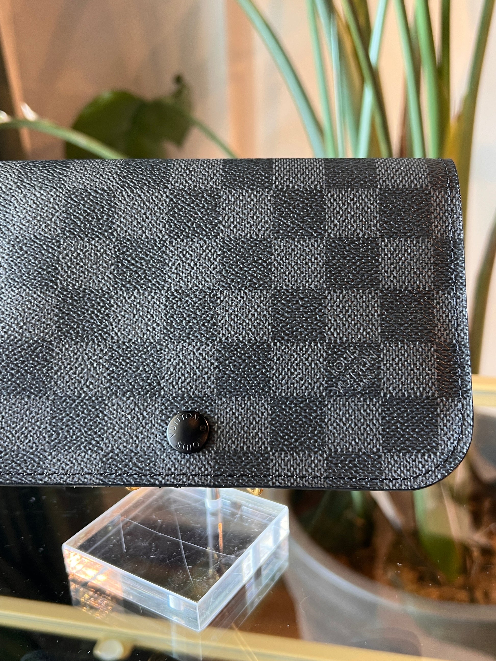 - Material: Coated canvas in the Damier Graphite pattern with leather trim
