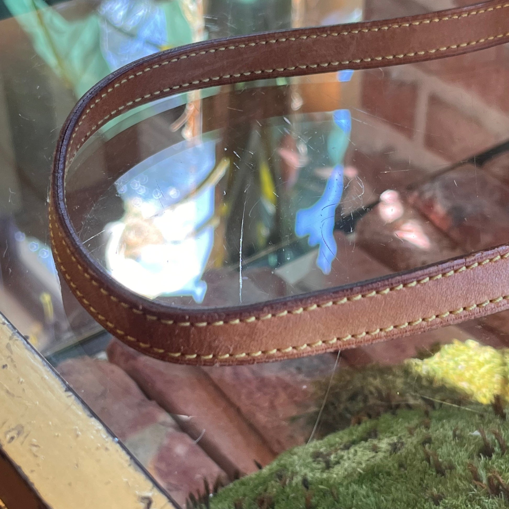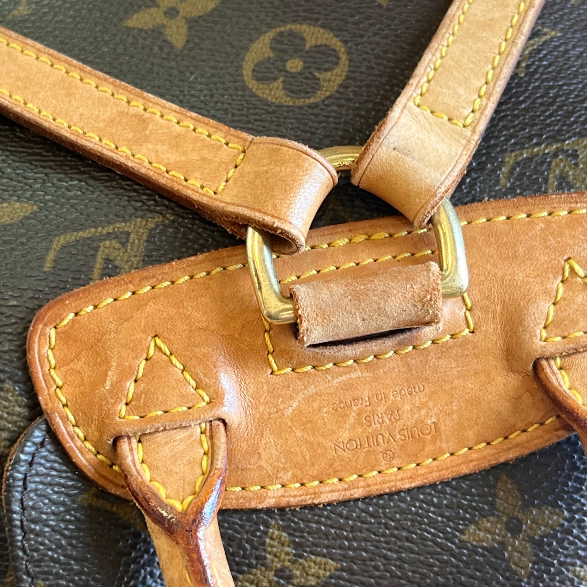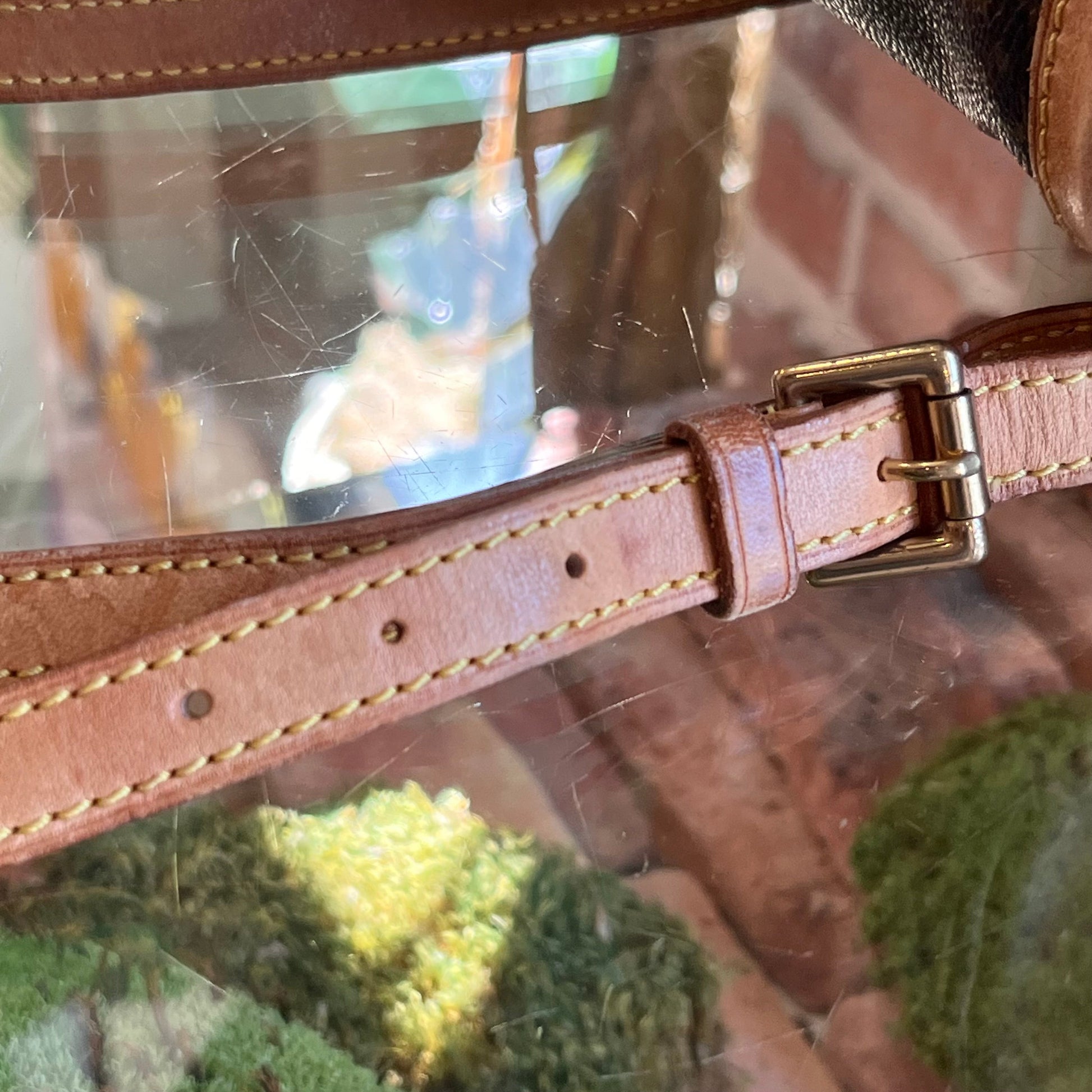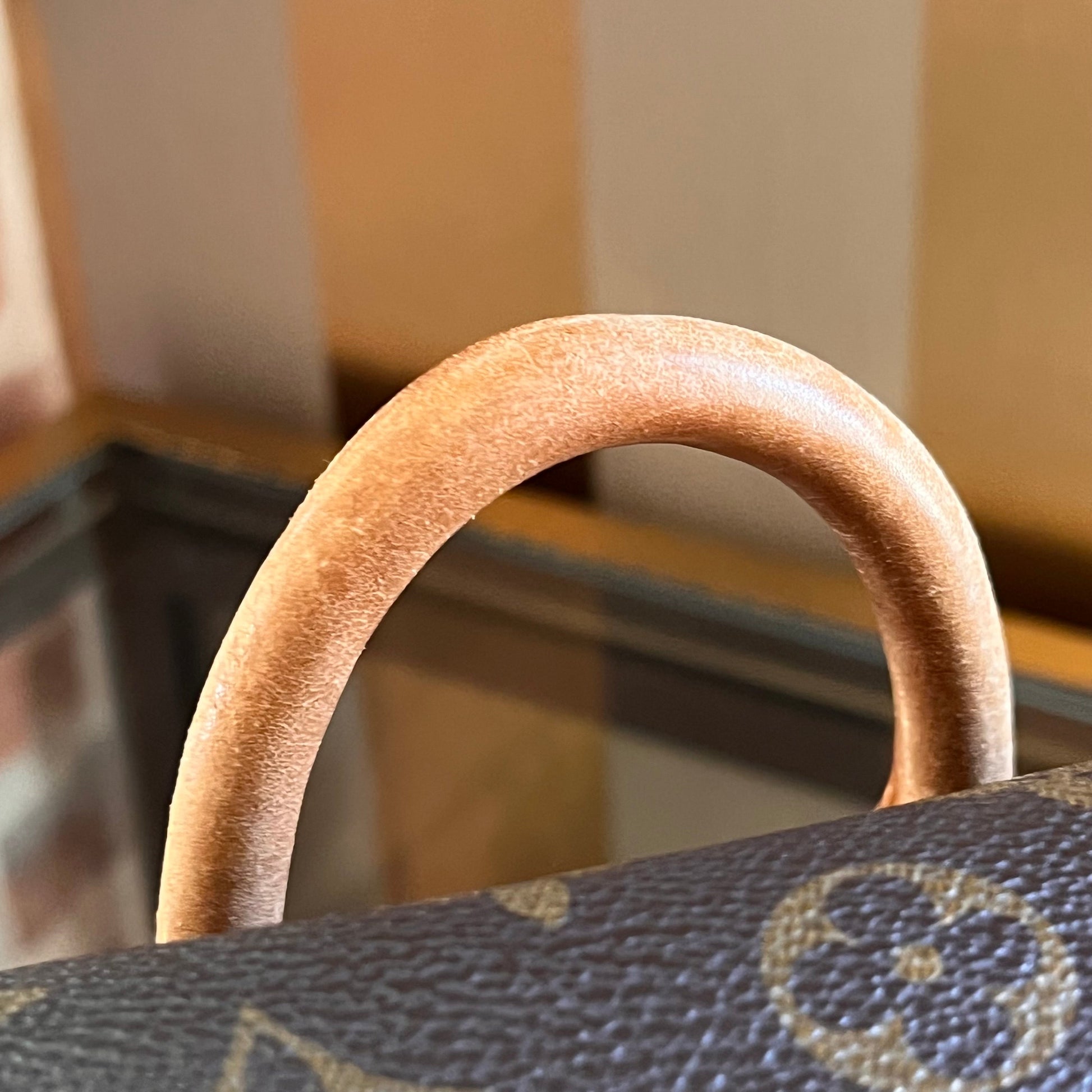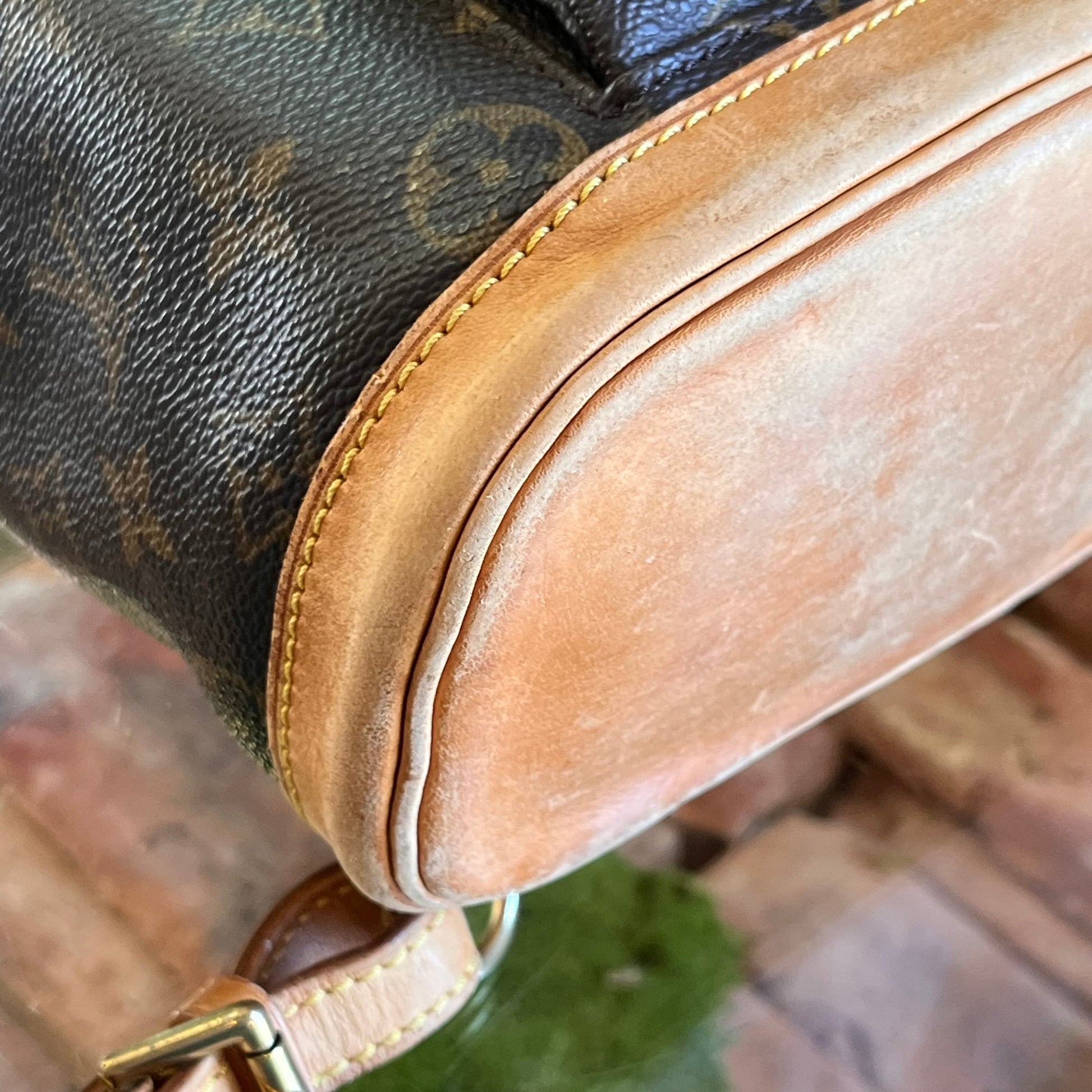 - Handle + Vachetta leather: The vachetta leather has heavy wear with a moderate patiana displaying wear such as: water spots, glazing wear, scuffing, soiling, rubbing, markings, dryness, general surface wear, creasing, scratches while appearing darker in certain areas(please refer to photos).