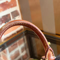 - Handle + Vachetta Trim: The vachetta leather has patianed displaying wear such as: water spots, scuffing, soiling, rubbing, markings, verdigris, creasing, scratches while appearing darker in certain areas(please refer to photos).