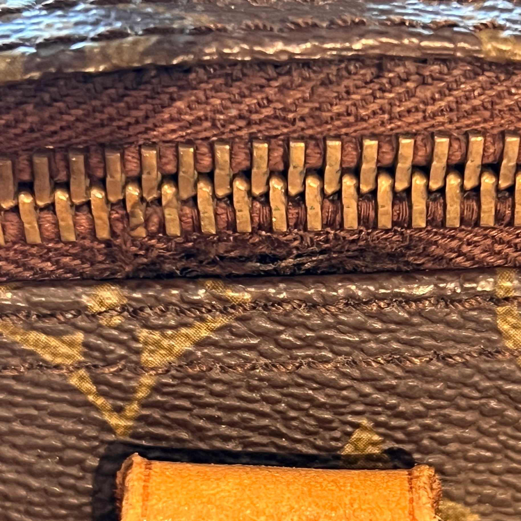 - Exterior: Has stains on the vachetta, fraying on the zipper body.
