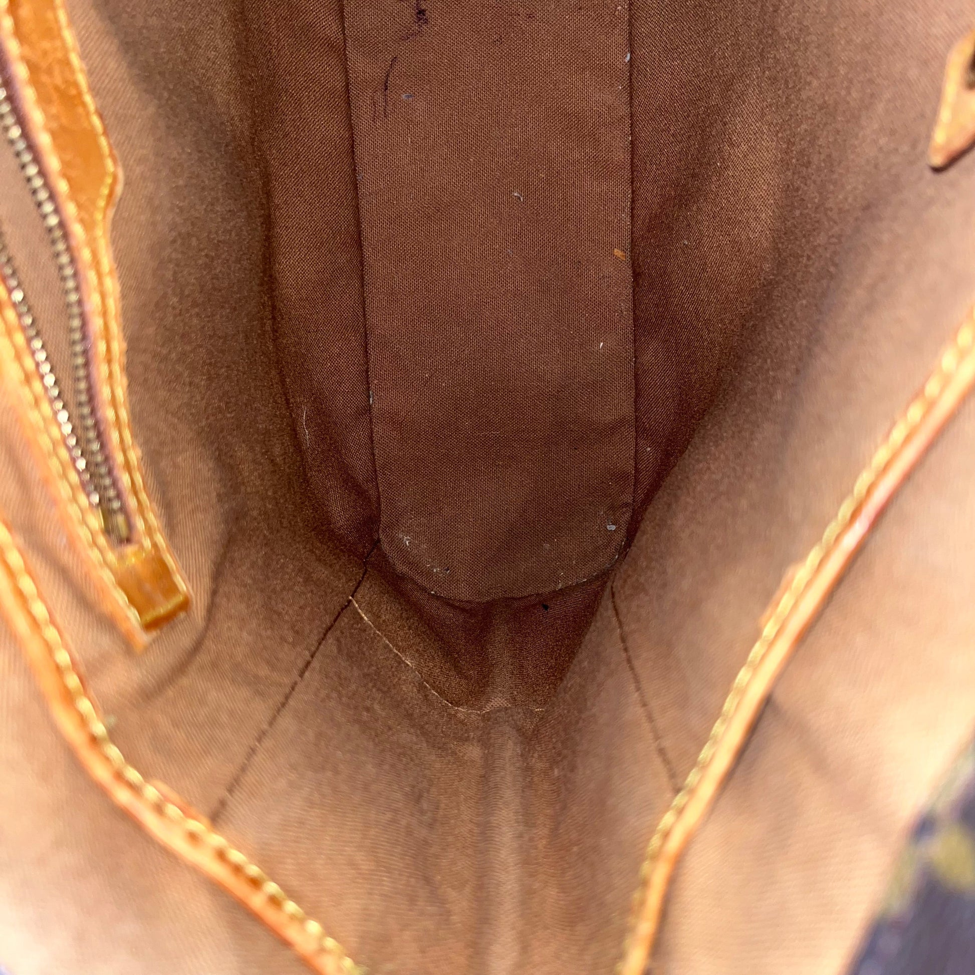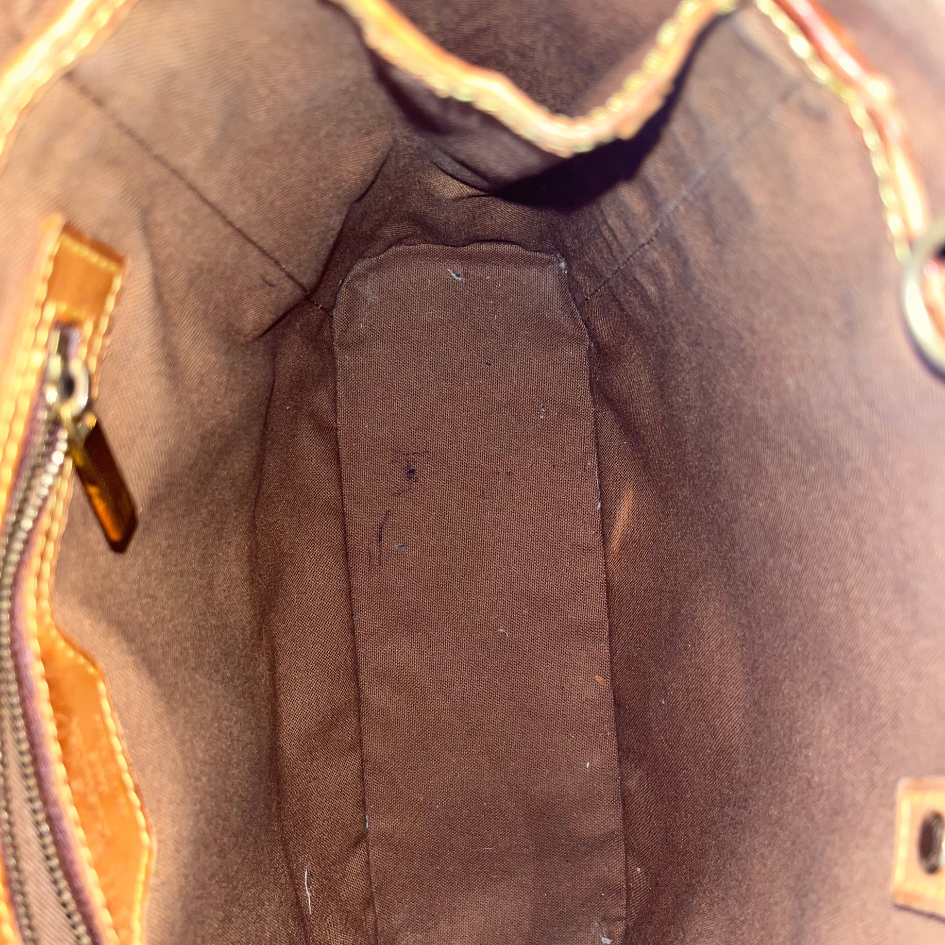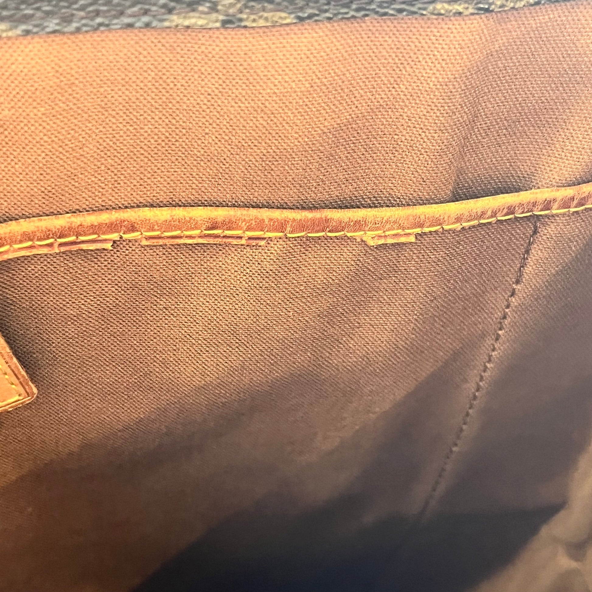 - Interior: The interior has staining that could possibly be cleaned if desired after purchase although it is wearable without. The vachetta leather trim has developed a dark caramel patina with displaying heavy signs of use such as: dryness, rubbing, scuffing, cracks, areas where it is missing along with oil/water marks.