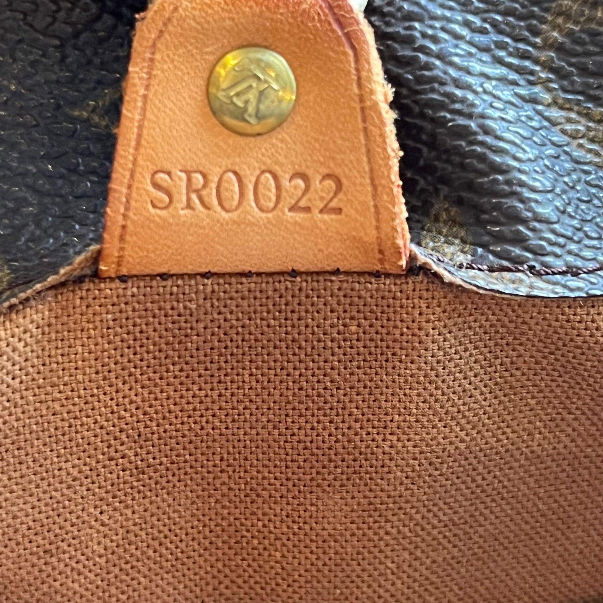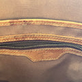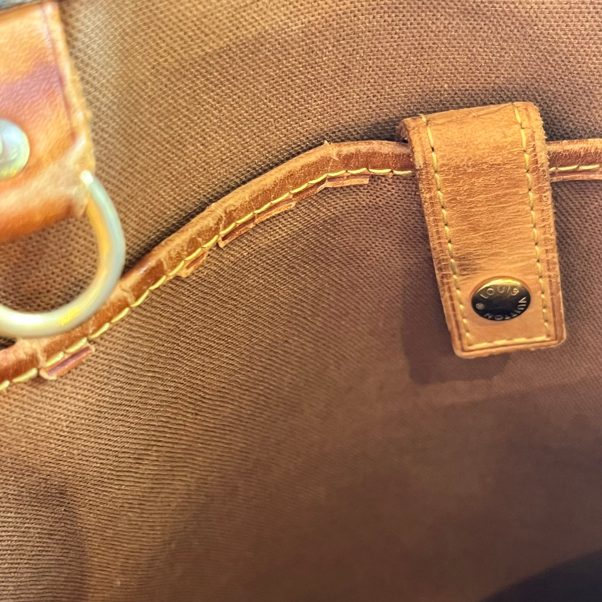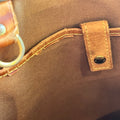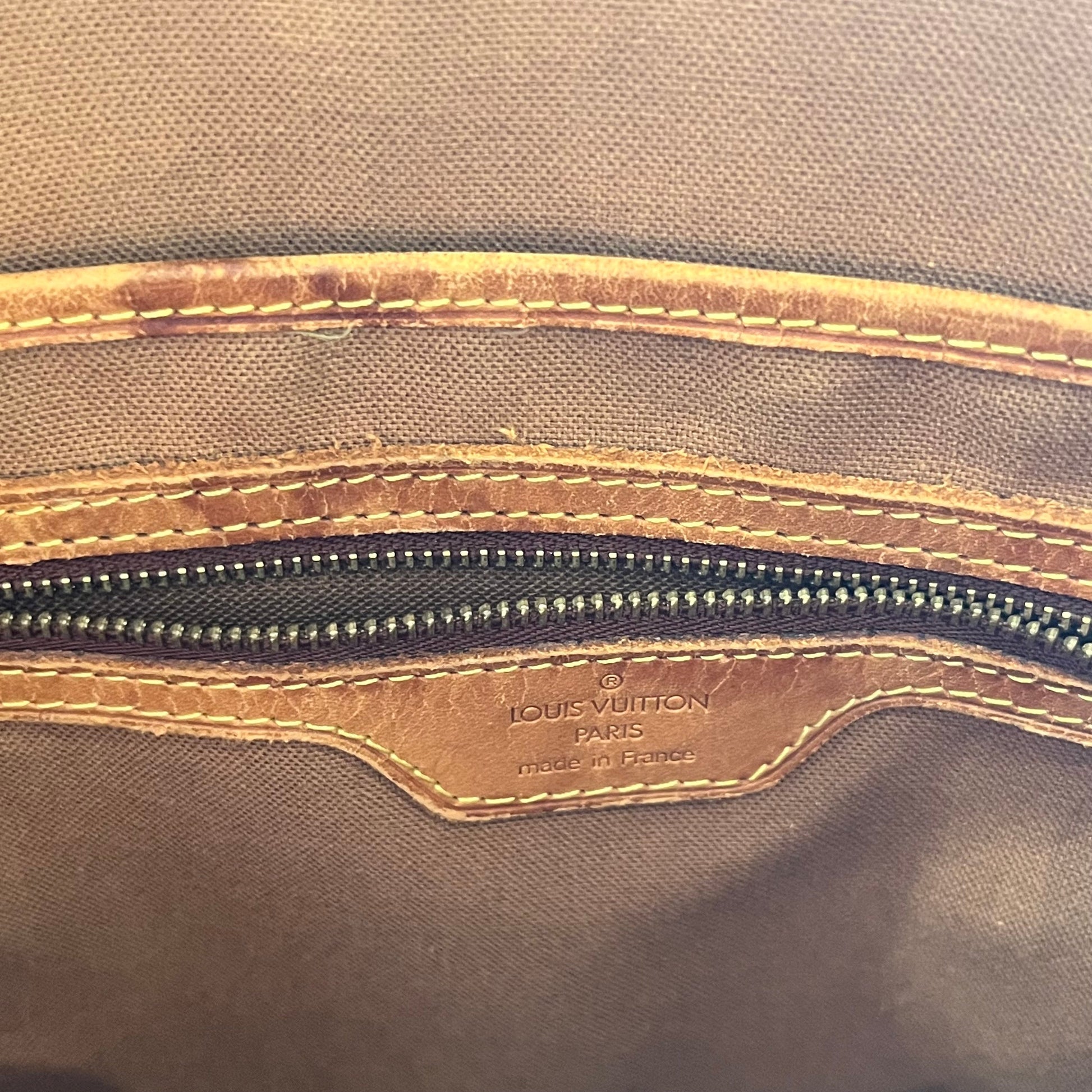 - Interior: The interior has staining that could possibly be cleaned if desired after purchase although it is wearable without. The vachetta leather trim has developed a dark caramel patina with displaying heavy signs of use such as: dryness, rubbing, scuffing, cracks, areas where it is missing along with oil/water marks.