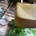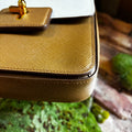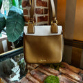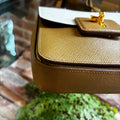 - Material: Iconic Saffiano leather in Caramel and Talco (white) colorblock finish
