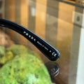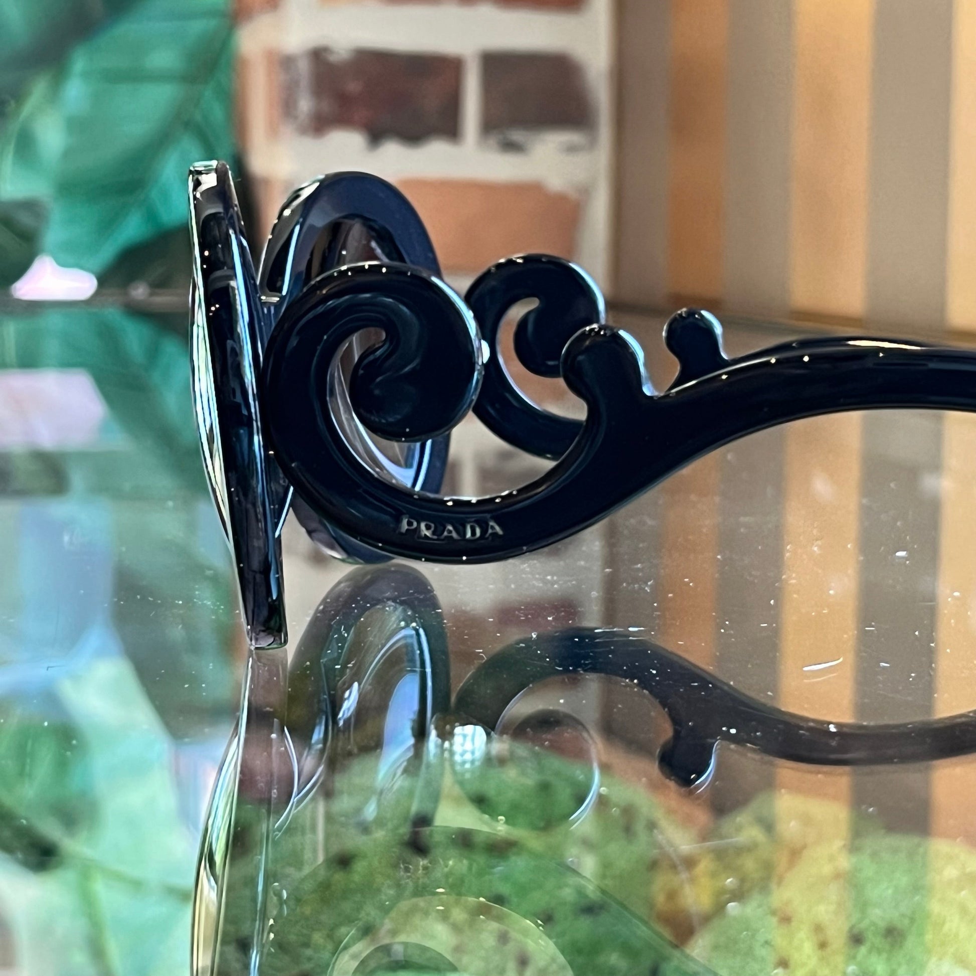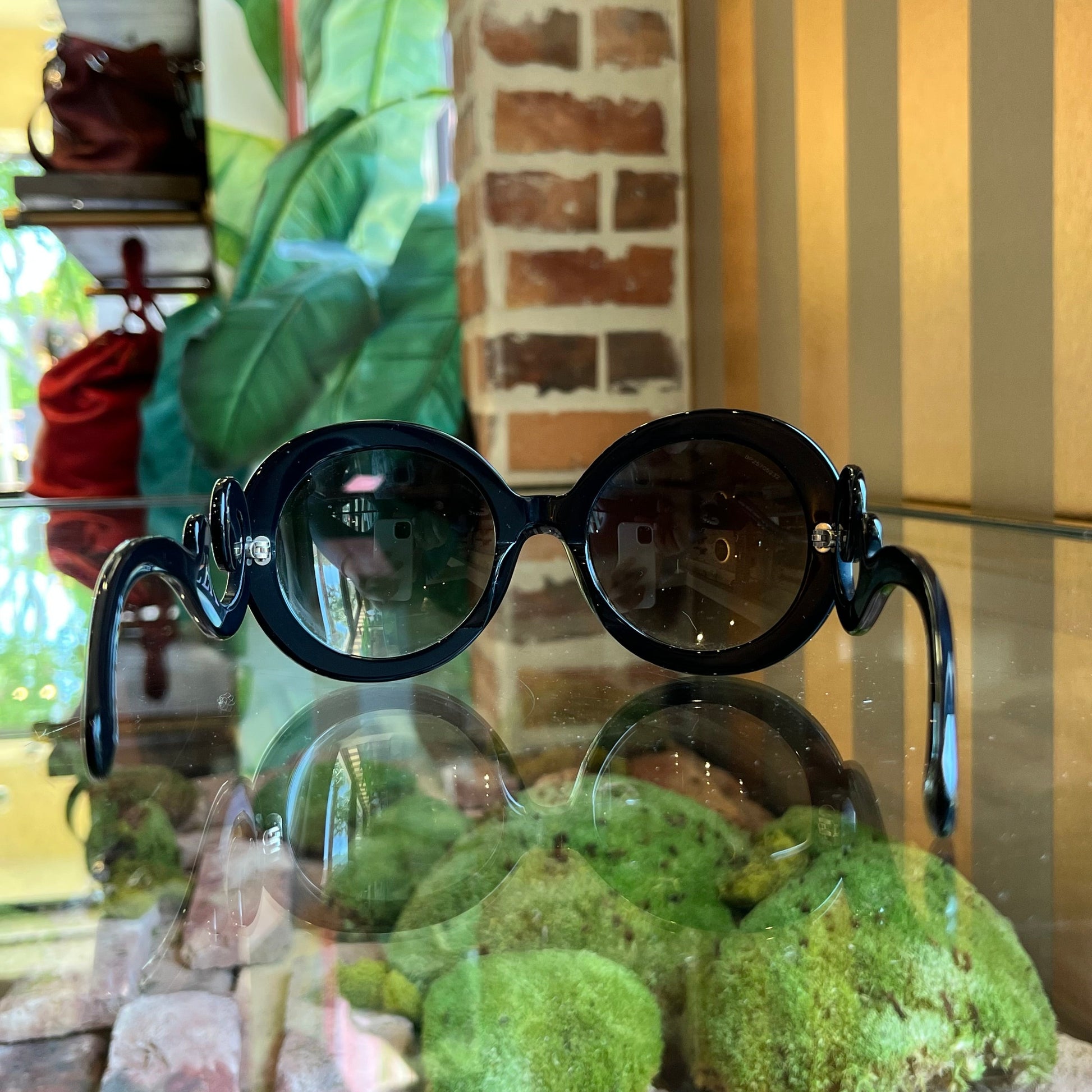 These Prada Black Acetate Baroque Round Sunglasses exude bold elegance with their iconic swirling temples and round frames. A statement accessory, they elevate any look with a touch of timeless glamour. B+ Very Good Condition