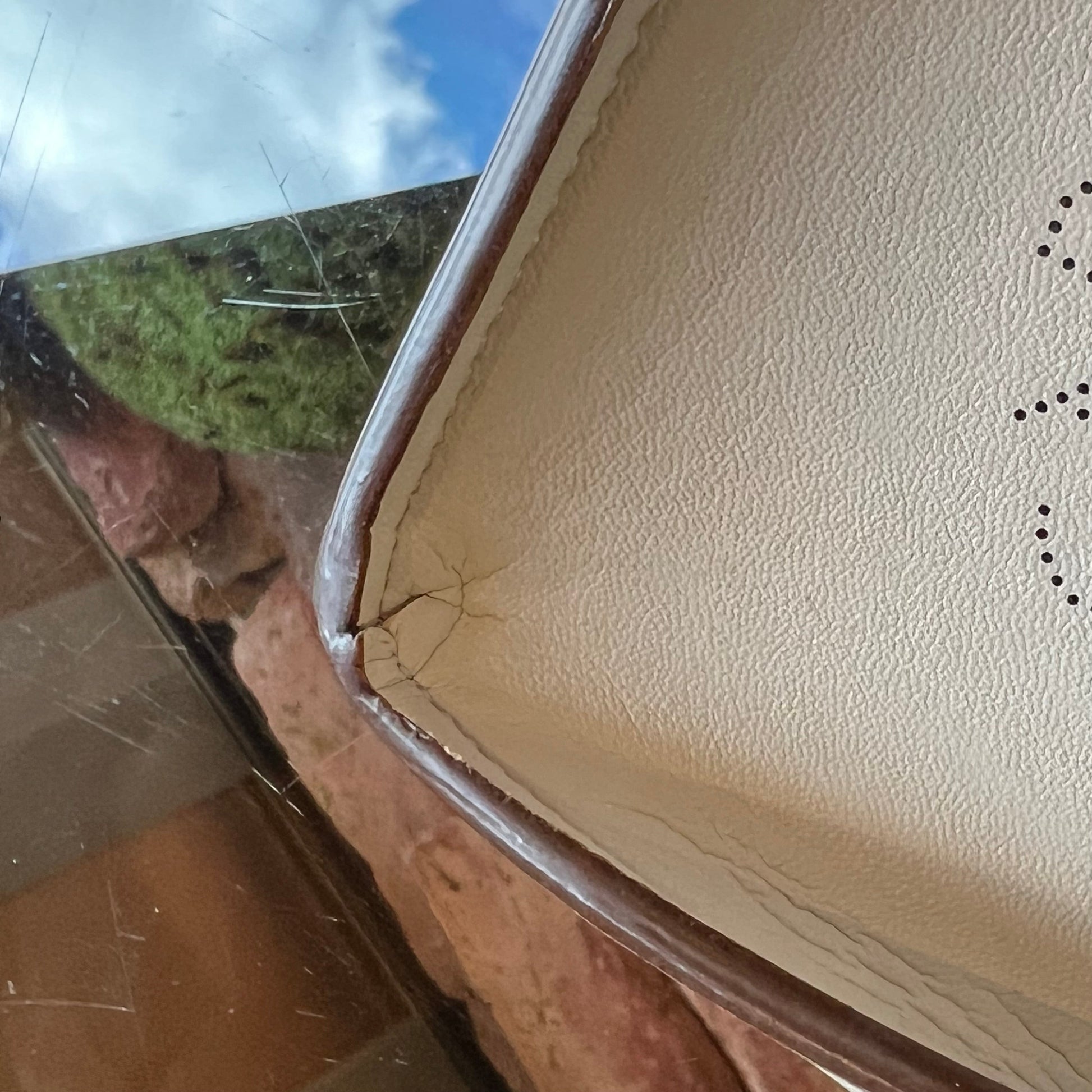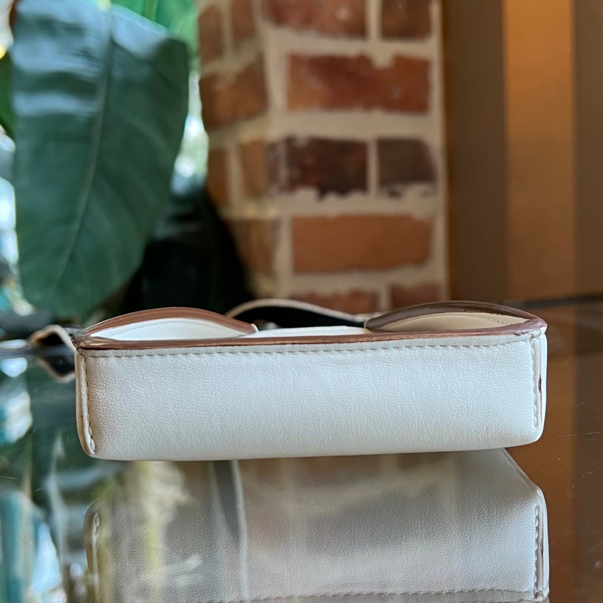 - Exterior: Rubbing, glitter, cracks to the glazing at the base of the straps and the corners and creasing. The faux leather is rich and supple.