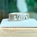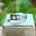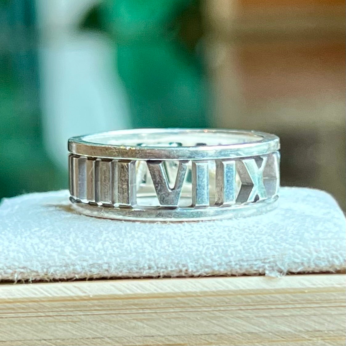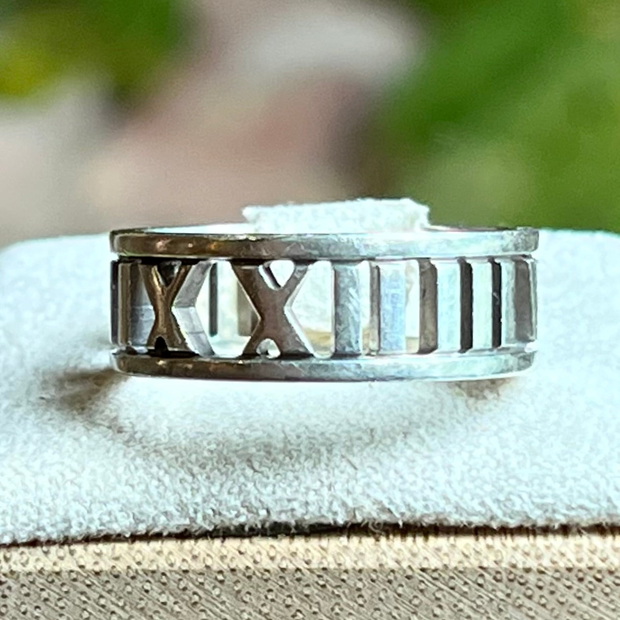 A sleek sterling silver ring featuring Tiffany's iconic Atlas Roman numeral design, offering a minimalist yet meaningful aesthetic. The bold engraved numerals wrap around the band, symbolizing timeless elegance with a modern edge. Perfect for those who appreciate understated luxury with a touch of personal significance. B+ Very Good Condition