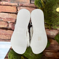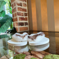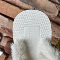 - Exterior: The soles are worn consistently with previous mild use. The midsoles displays gentle marks and subtle soiling. The fur remains clean and vibrant. Overall they're in very good condition, likely primarily used in indoors.