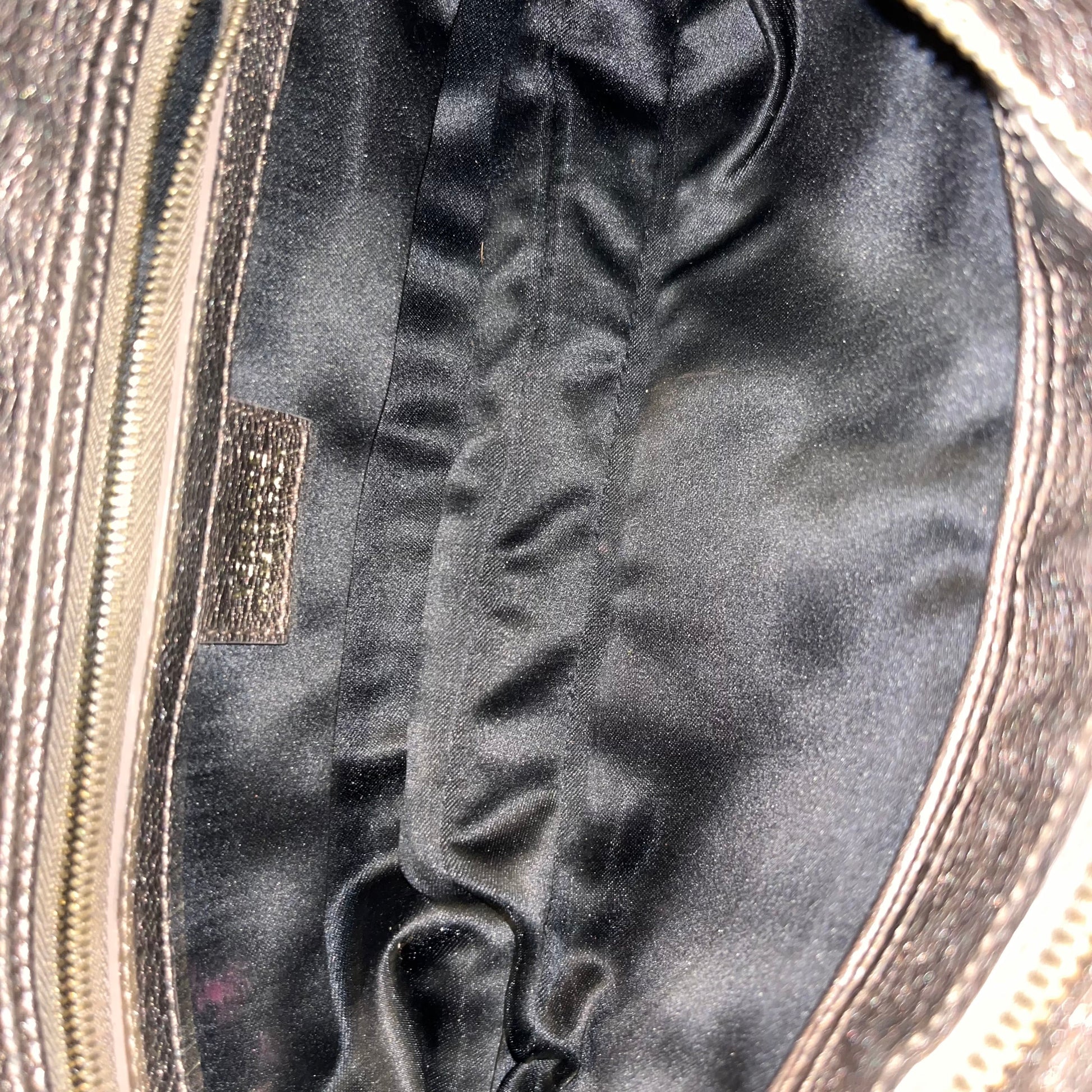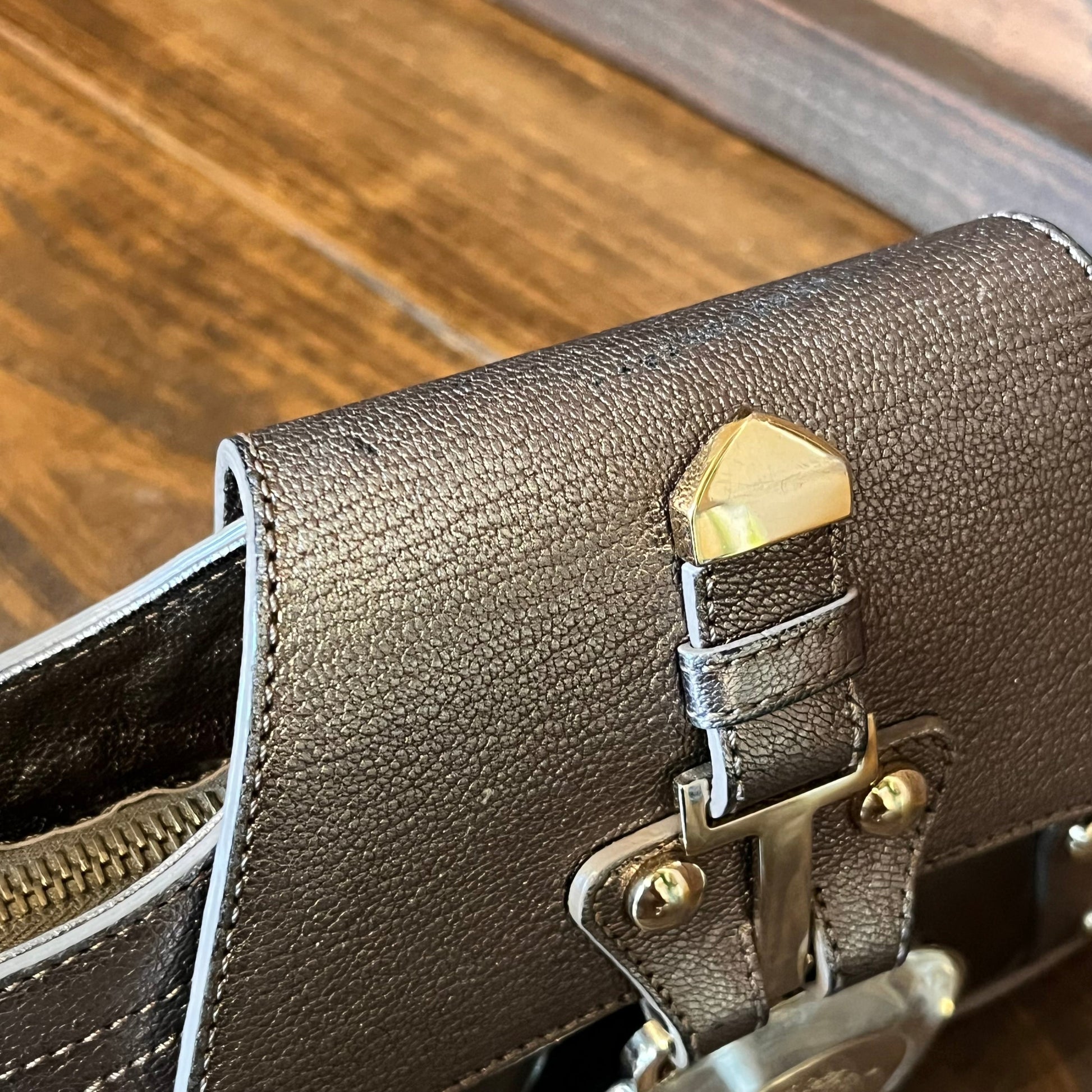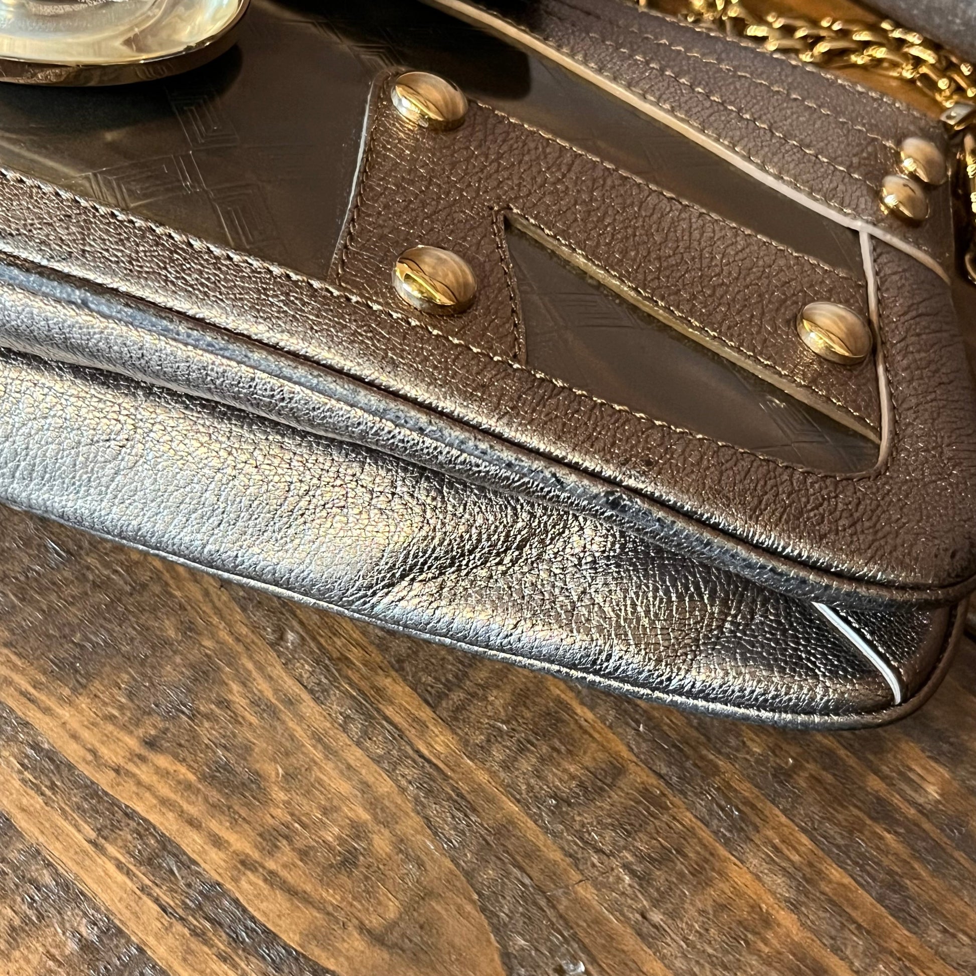 - Handle: The hardware is bright and shiny with heavy scratches.